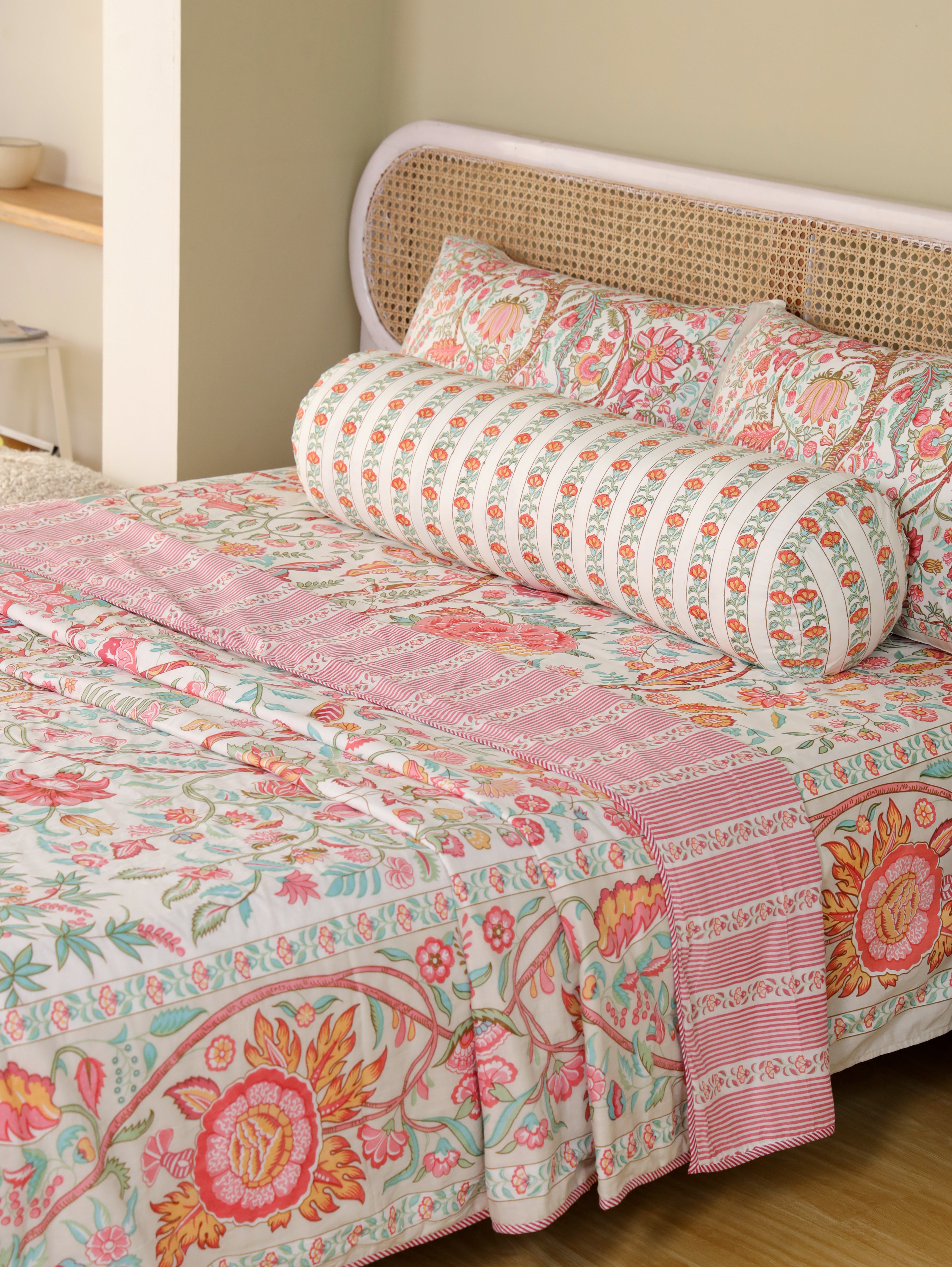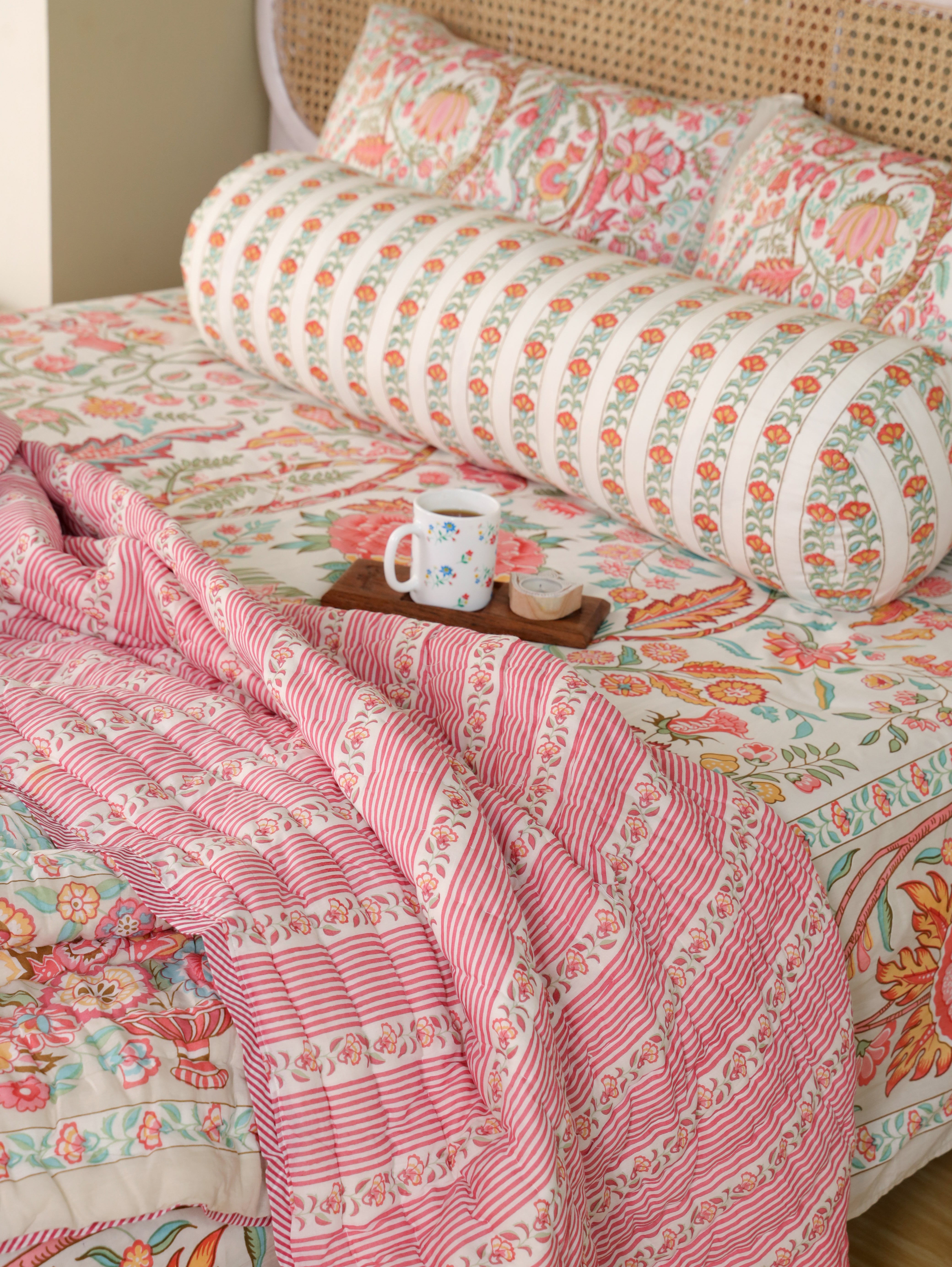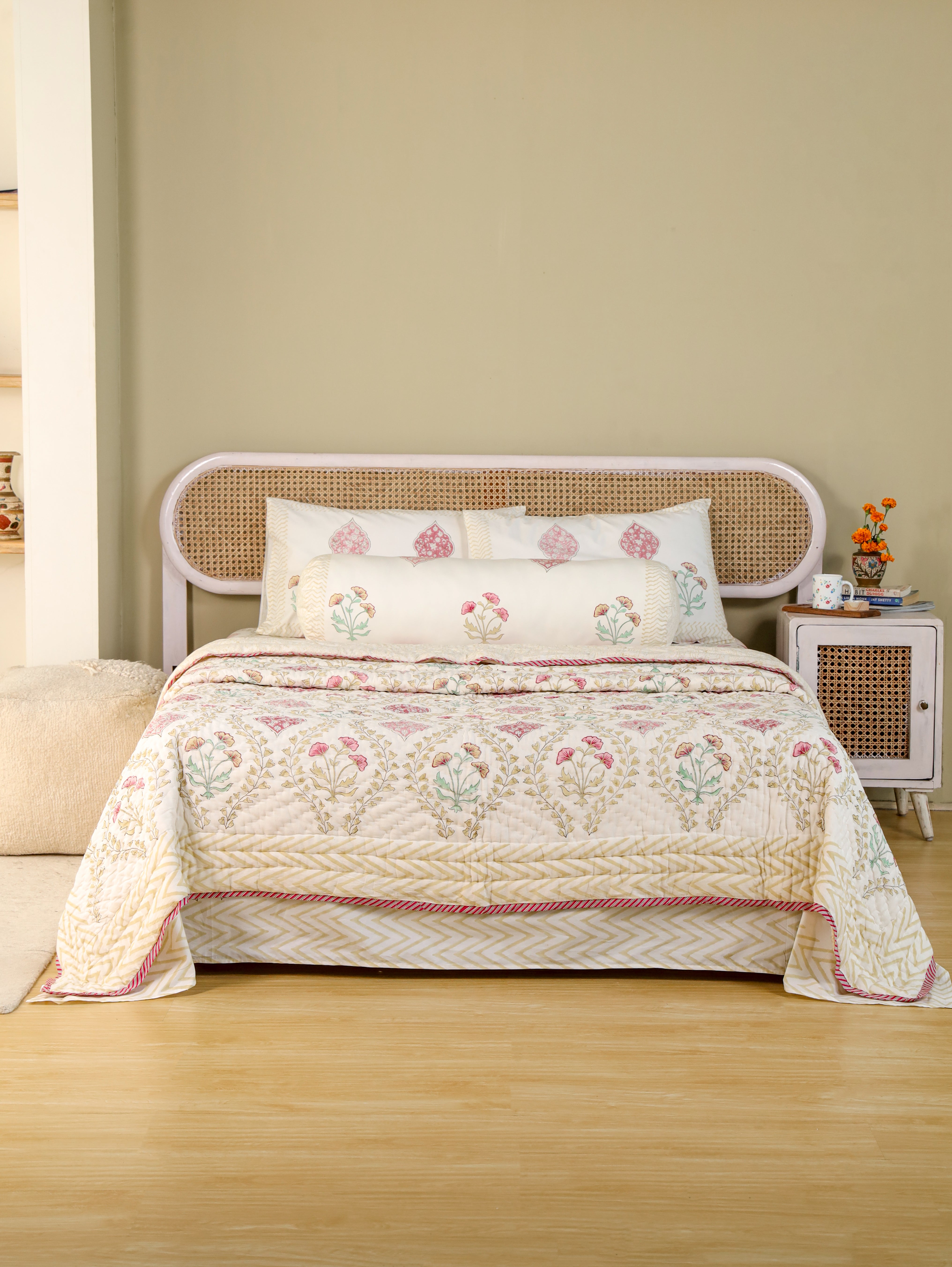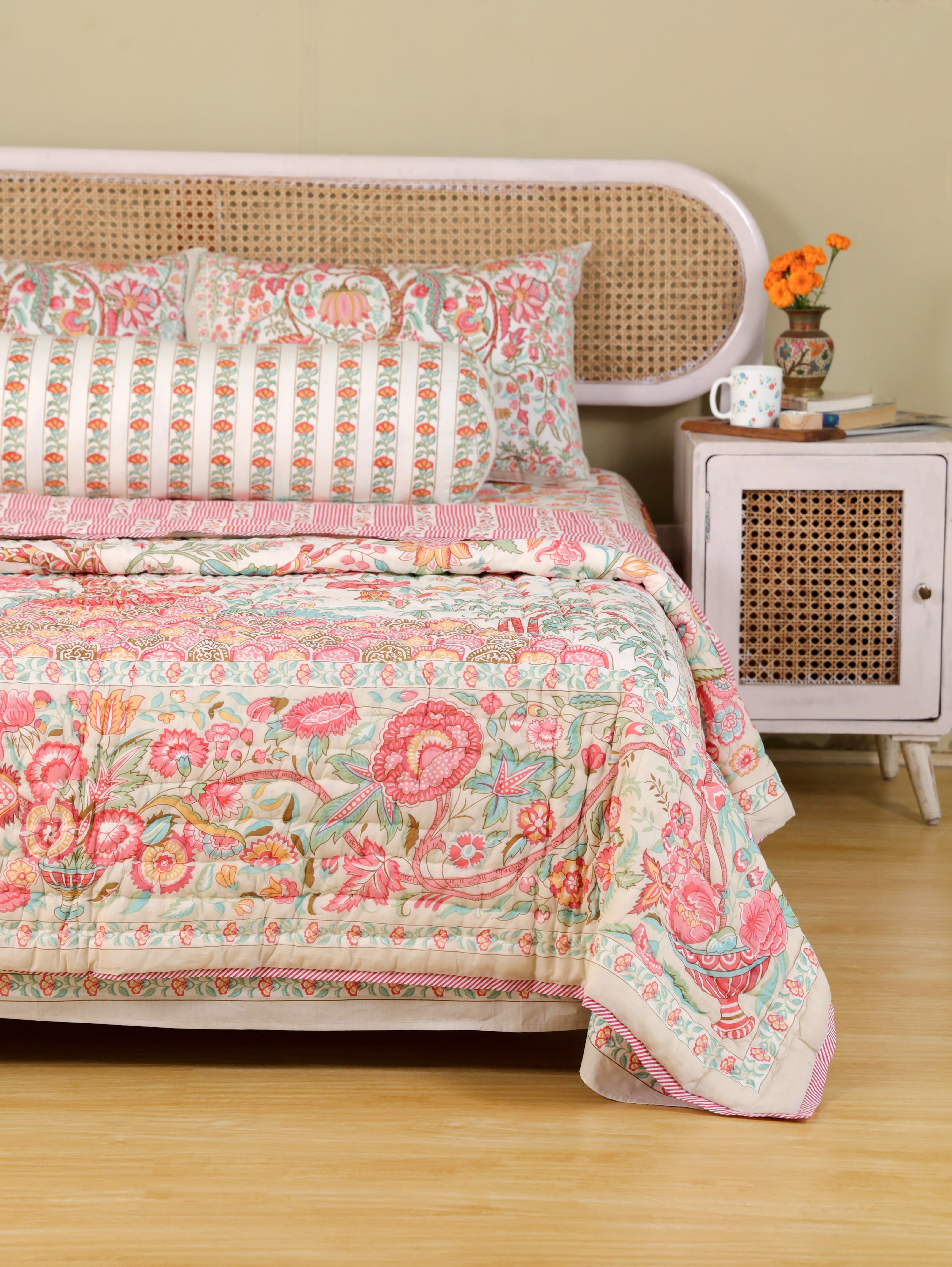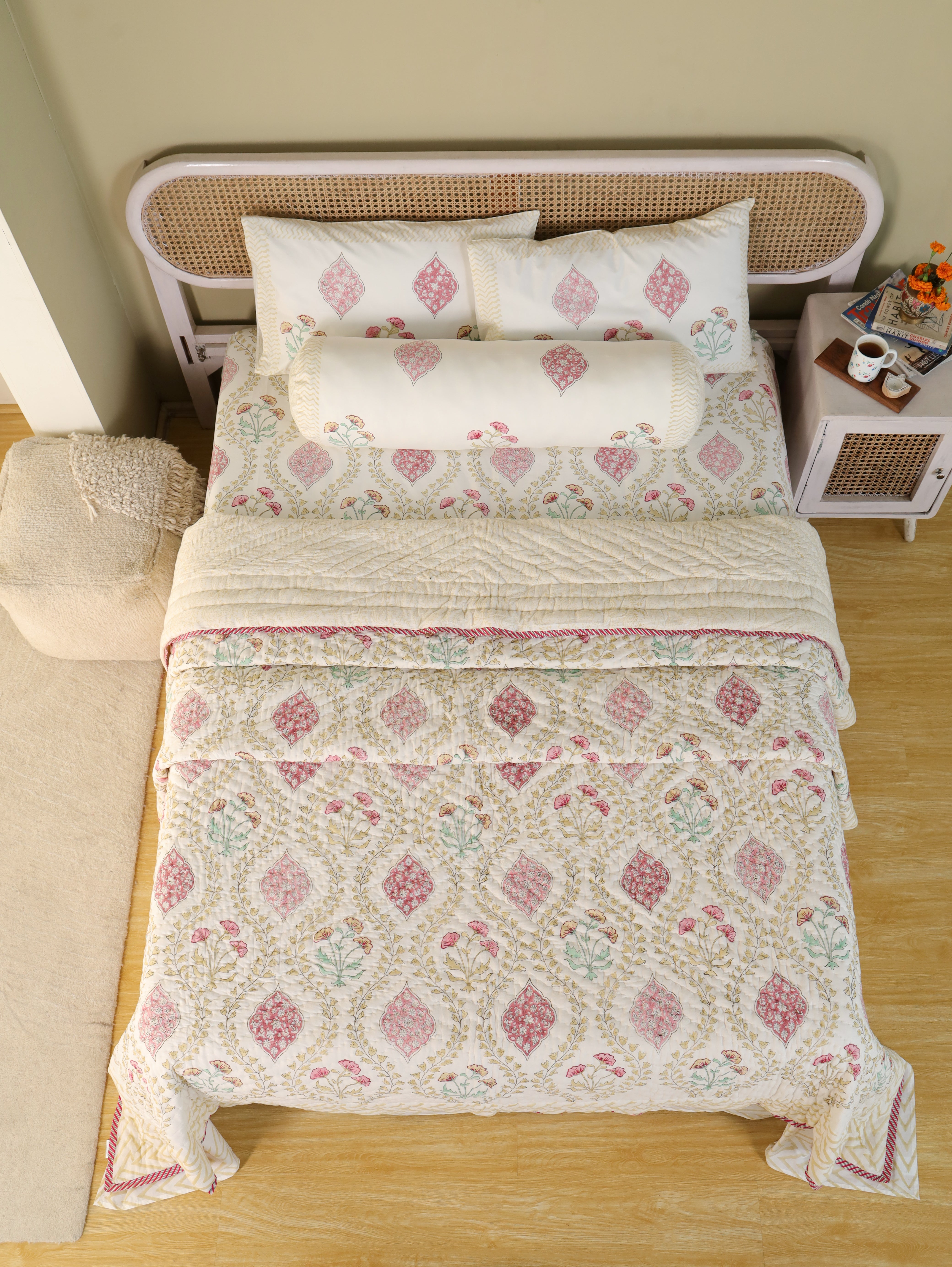 Handblock Printed Quilt, Bedsheet & Pillow Covers Set - Ellen Pale Pink