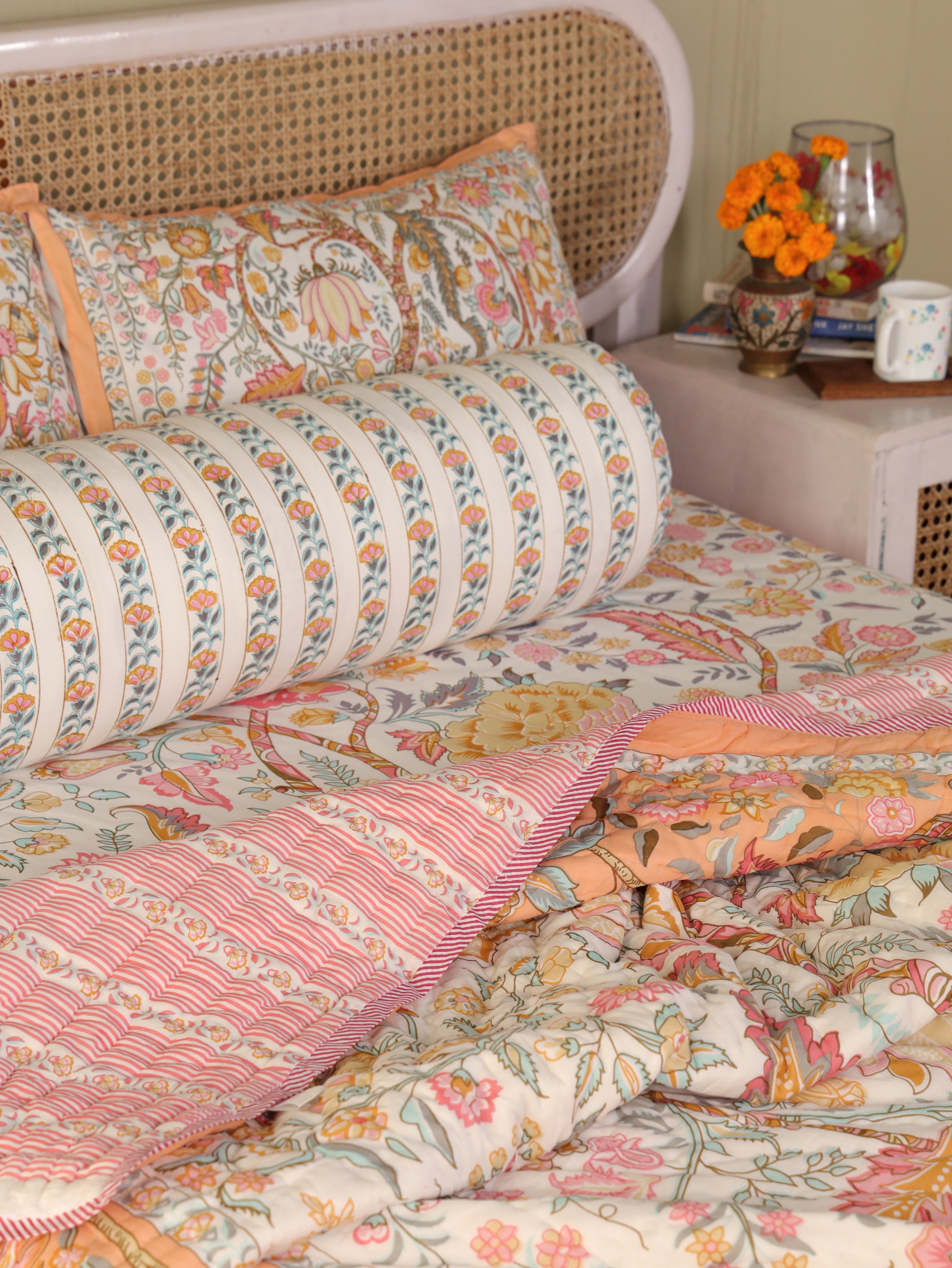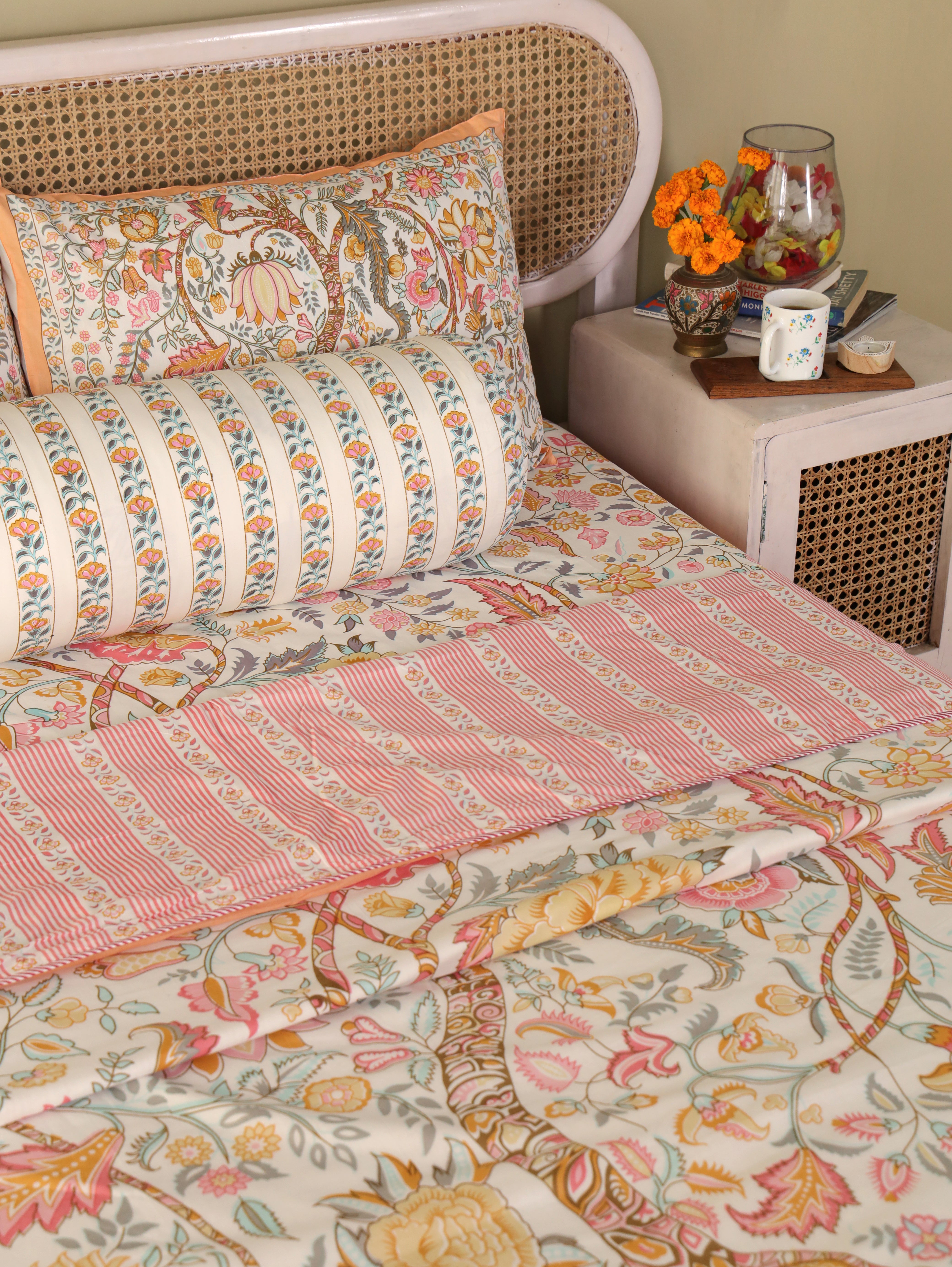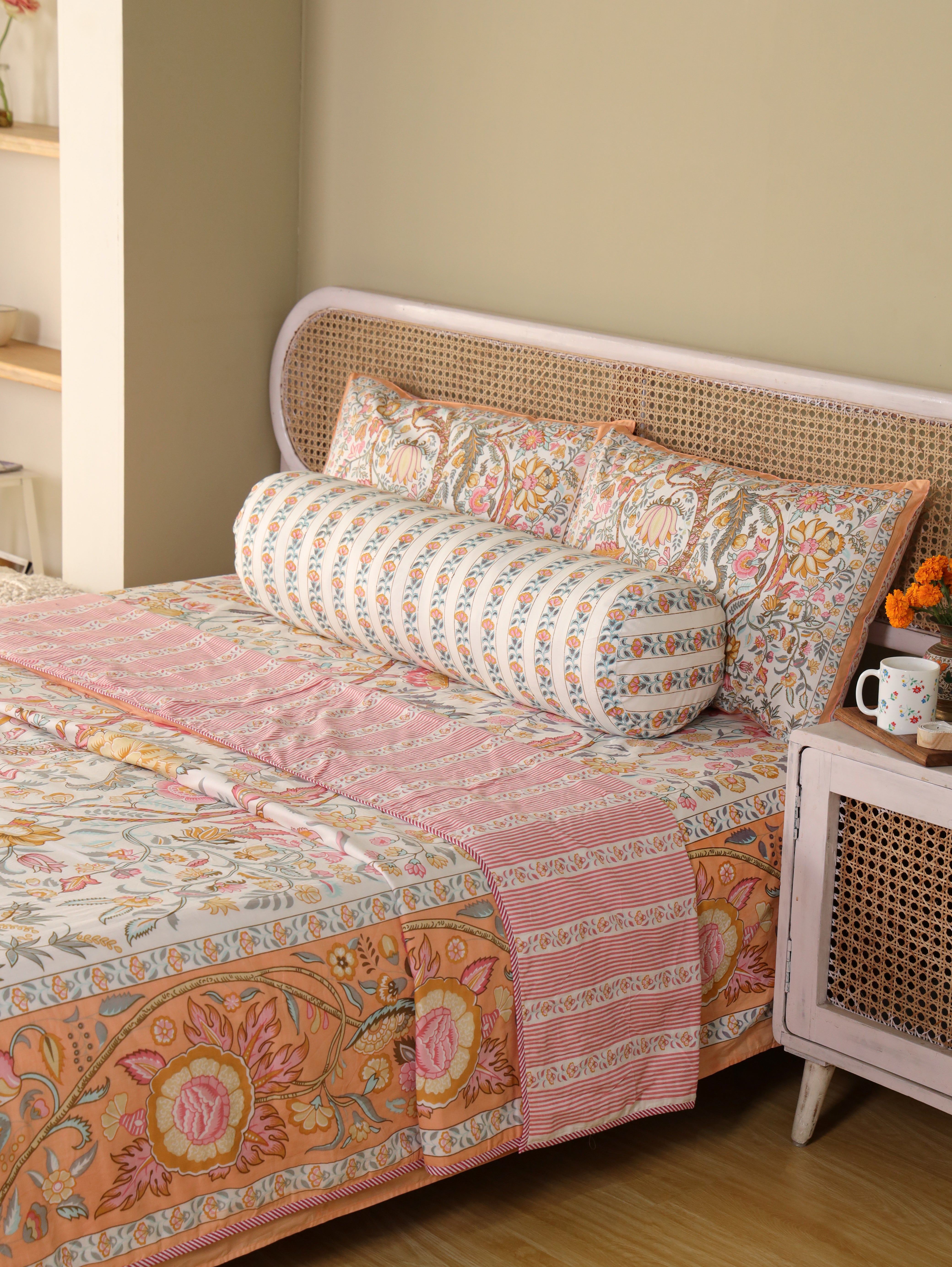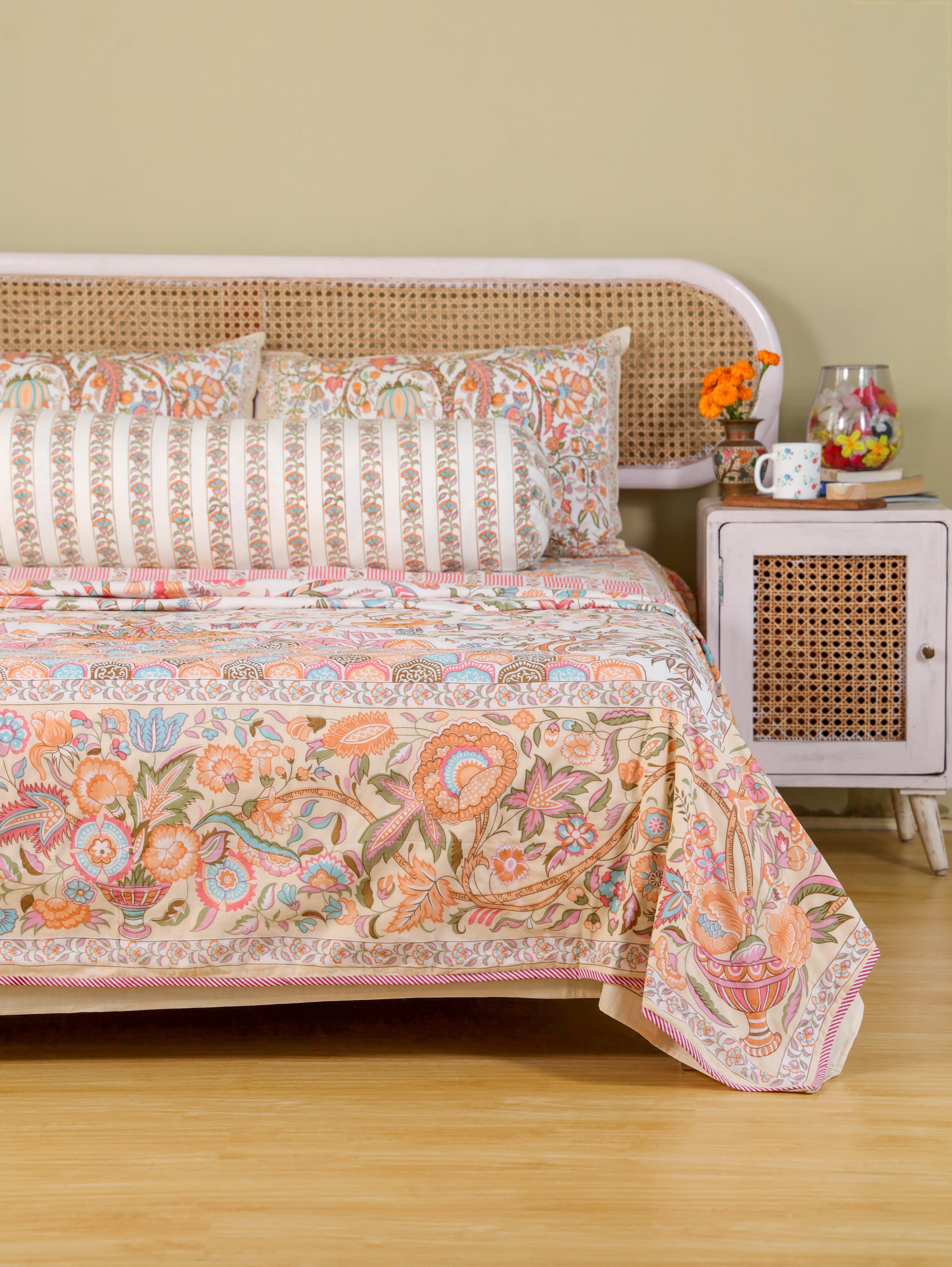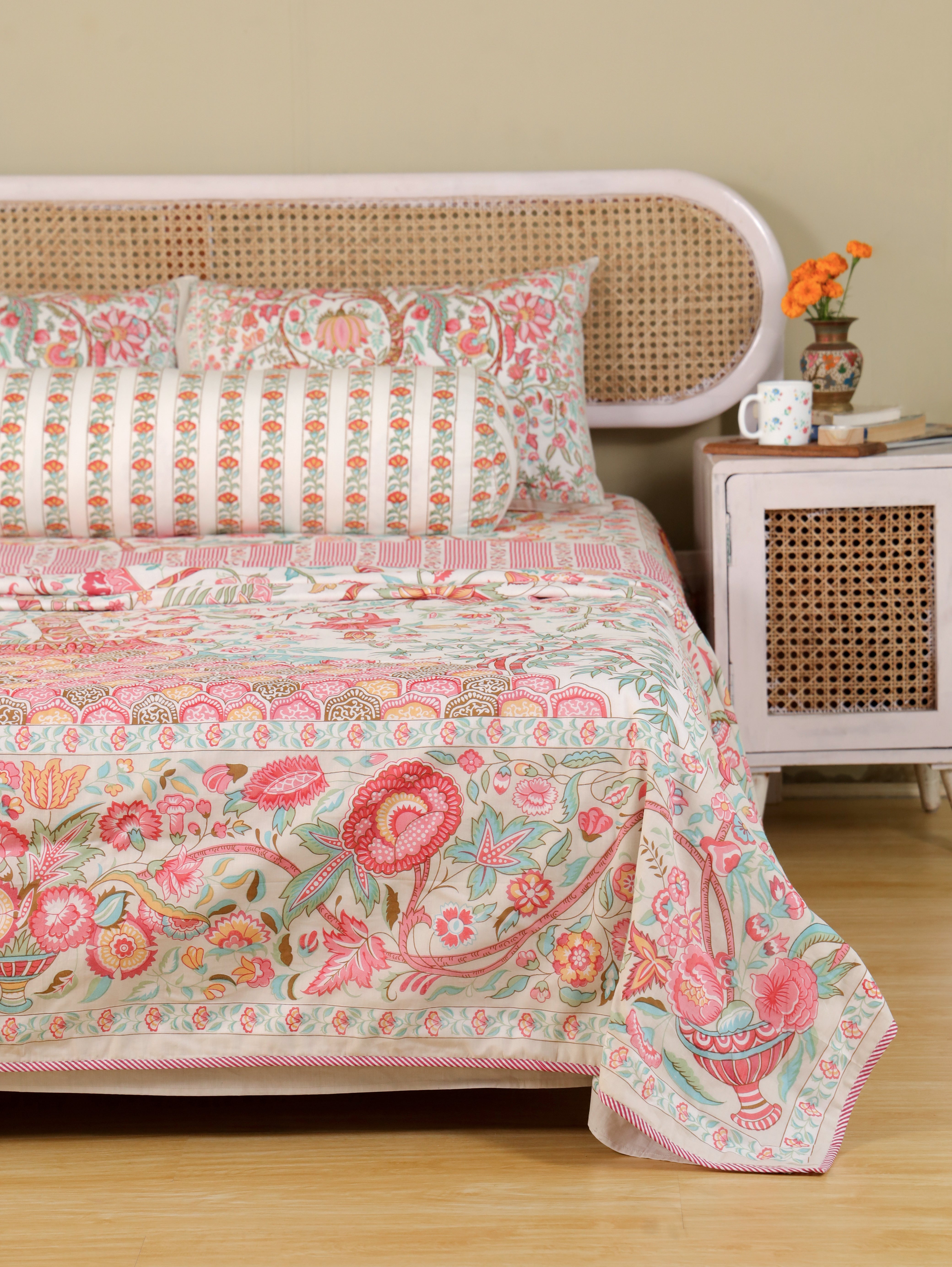 Handblock Printed Quilt, Bedsheet & Pillow Covers Set - Ellen Pale Pink