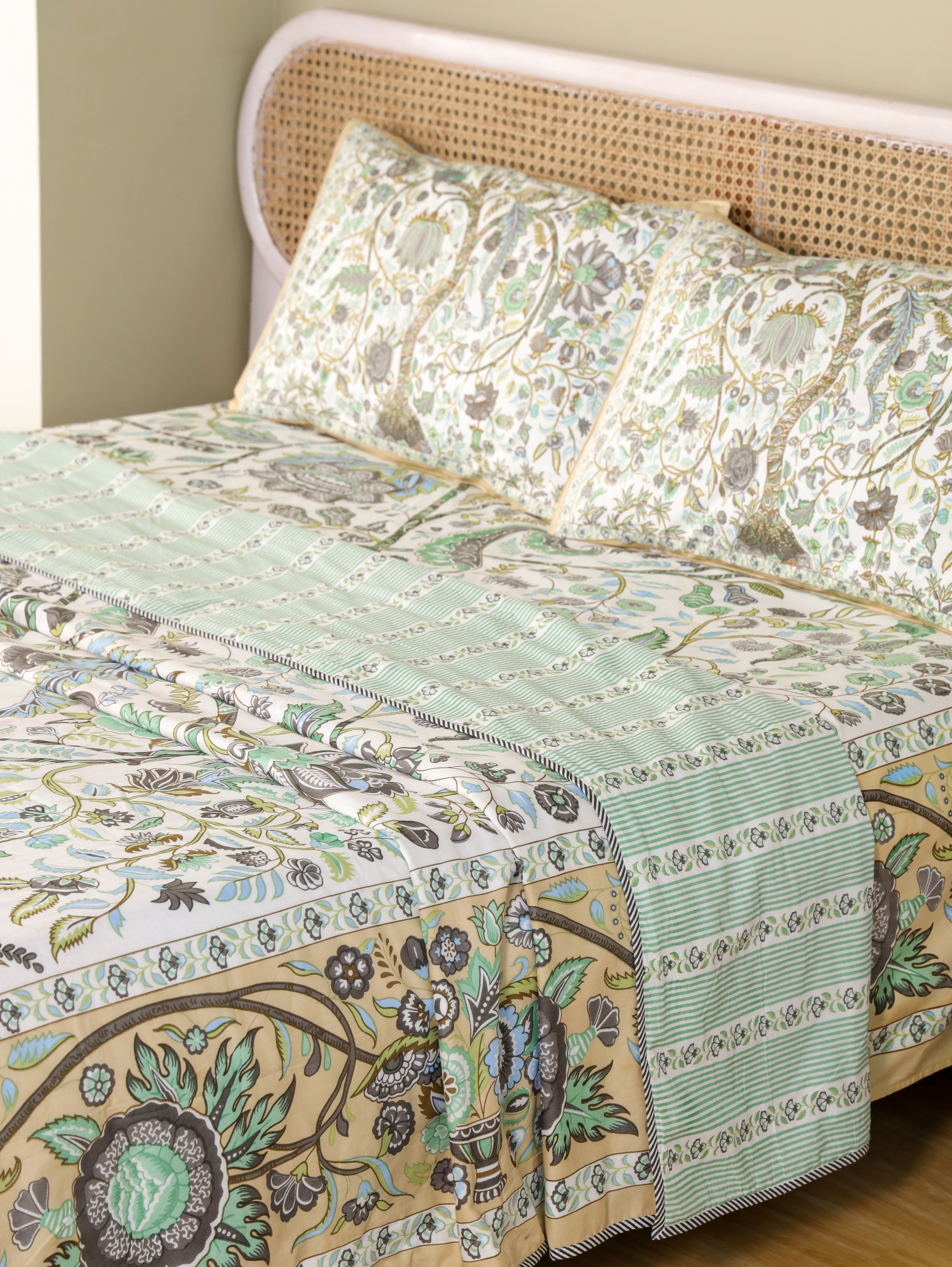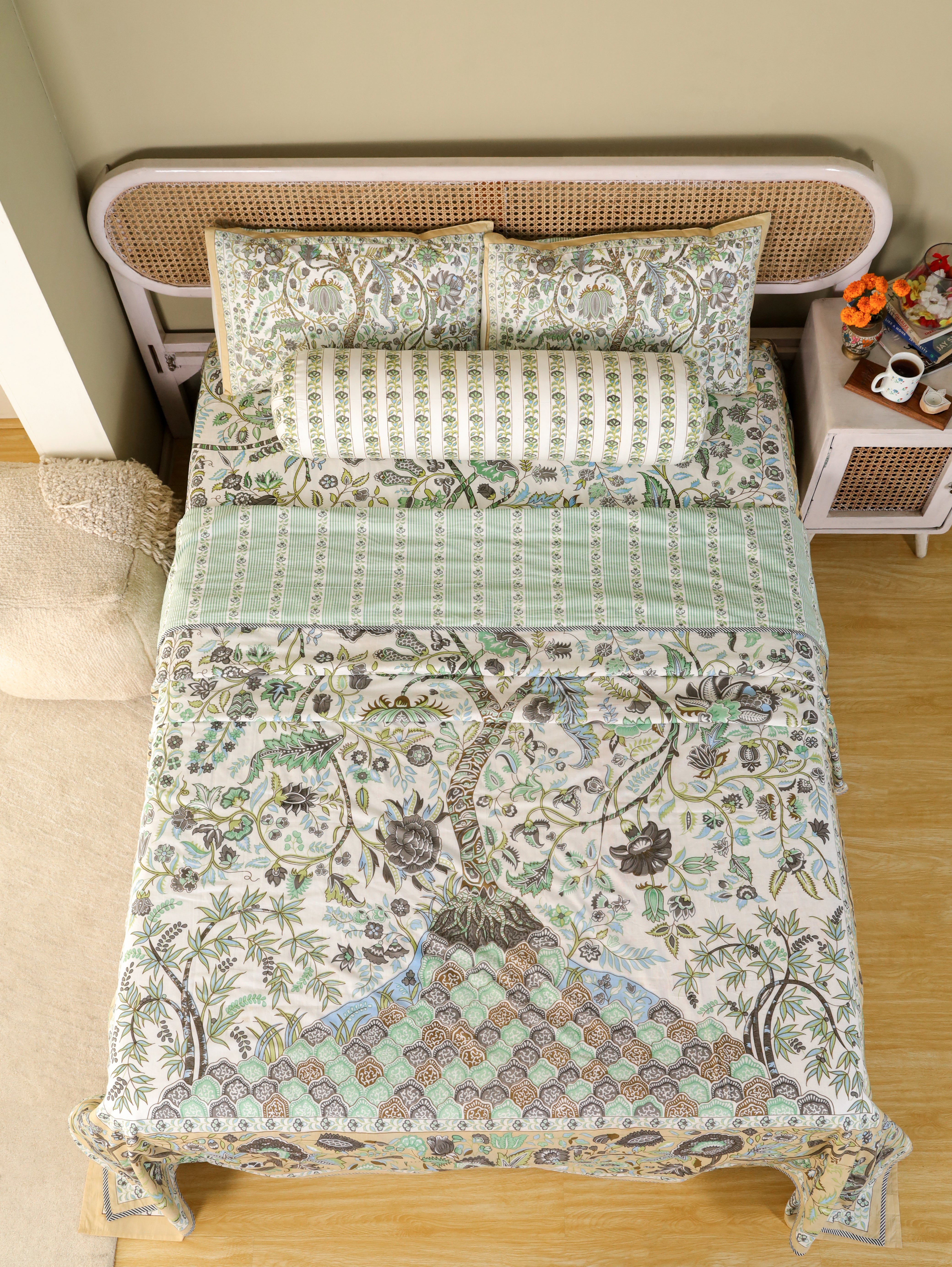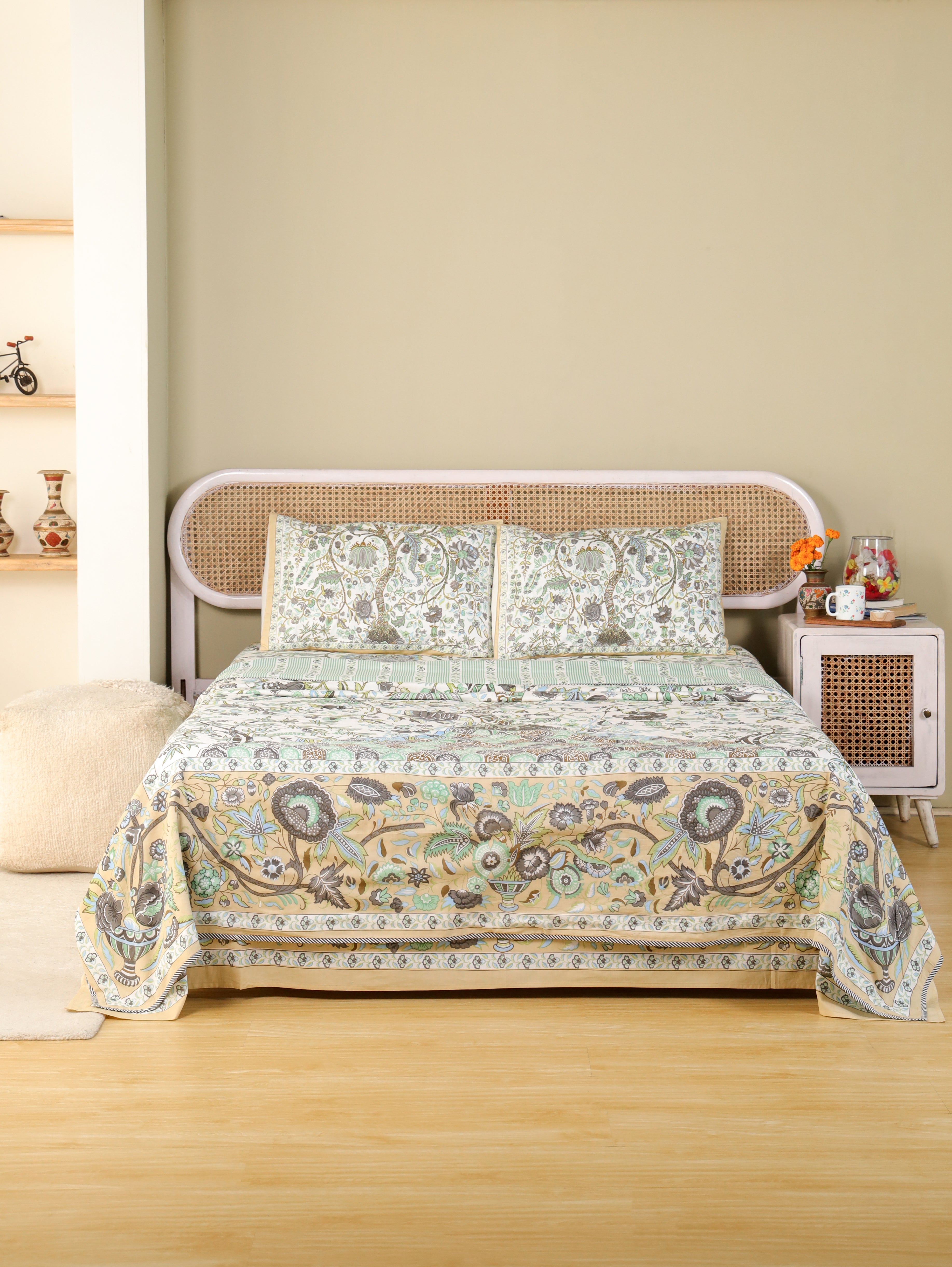Tree of Life Beige & Green - 4 Pcs- Bedsheet, Katha & Pillow covers Set