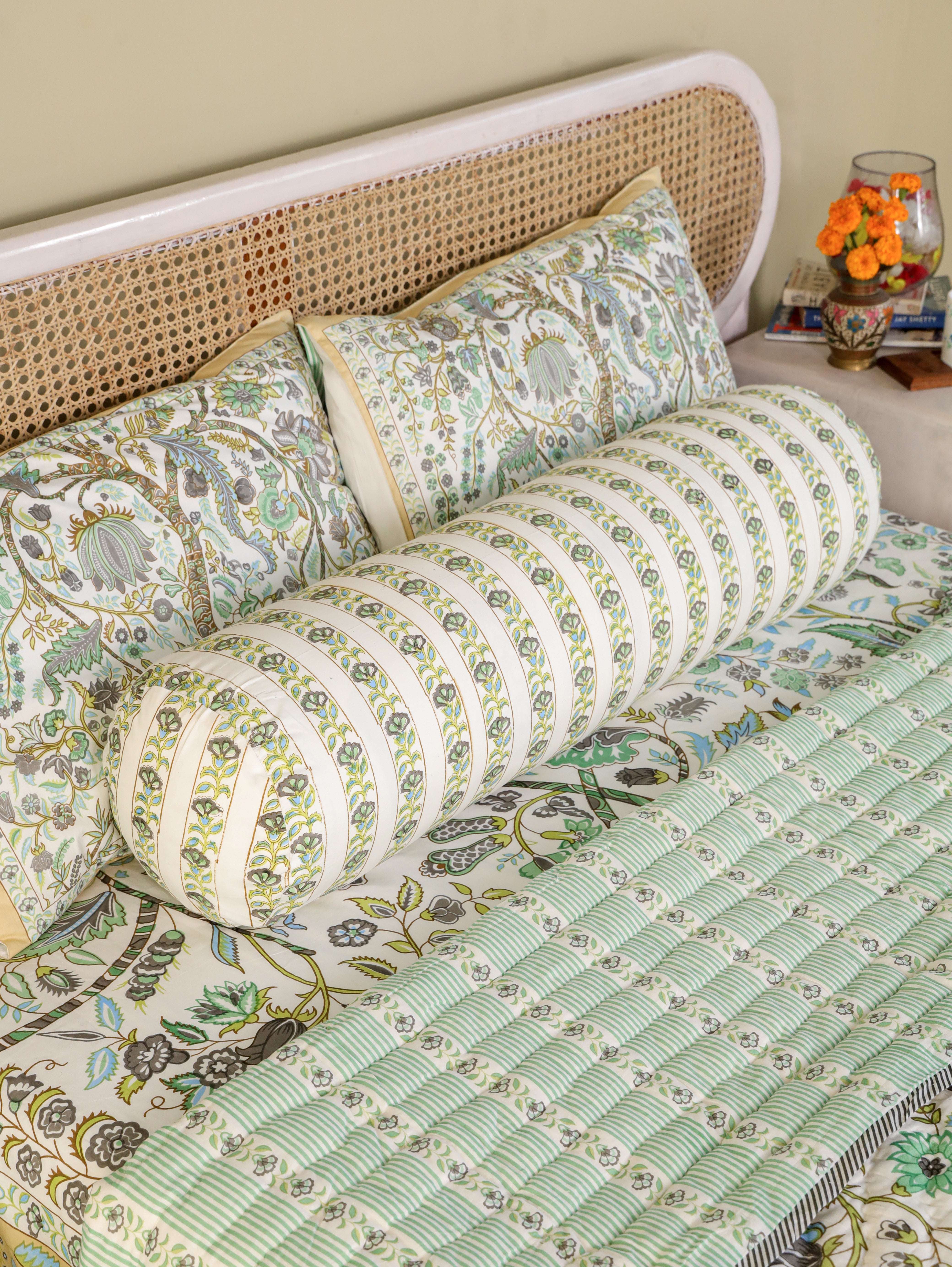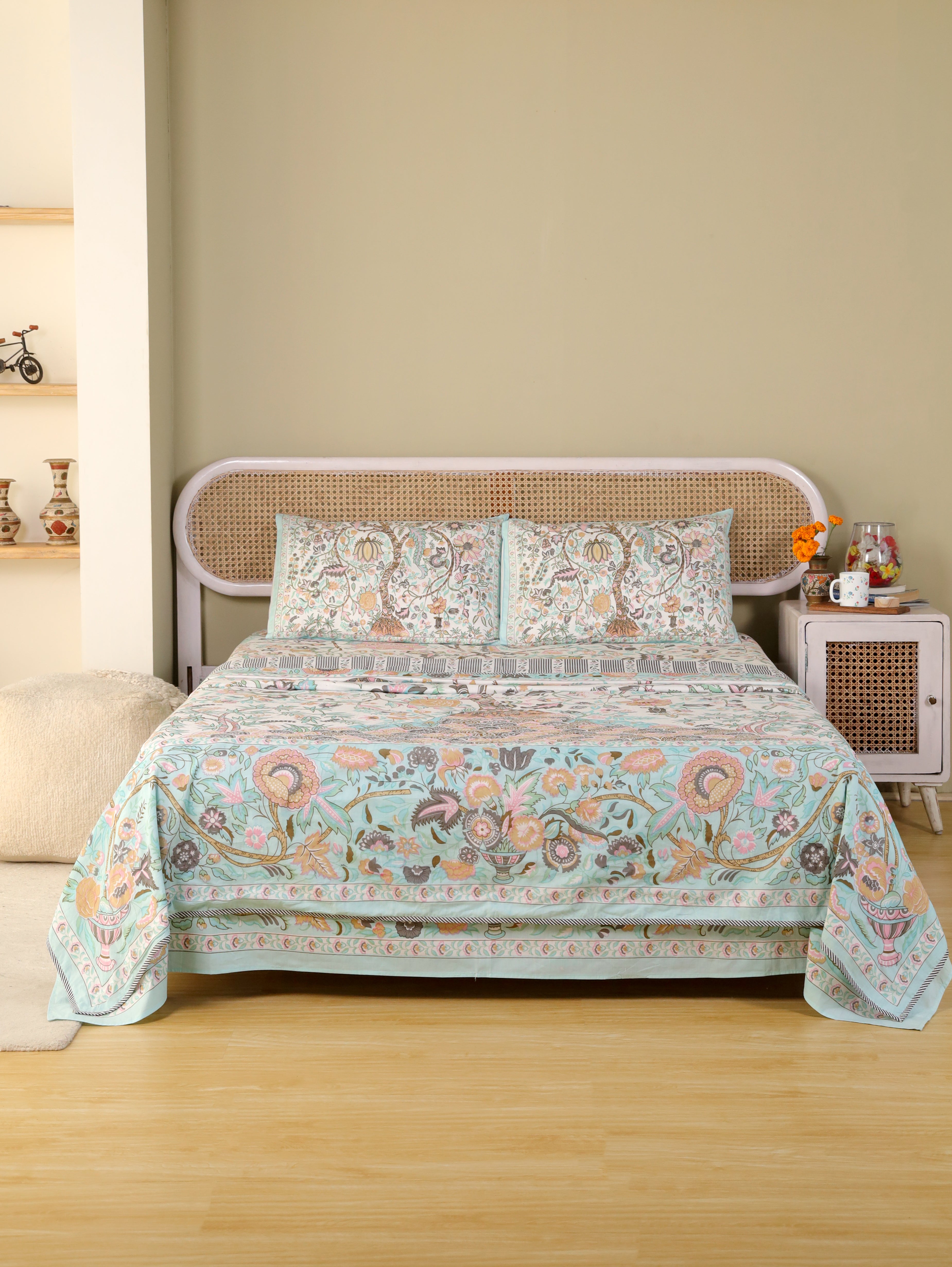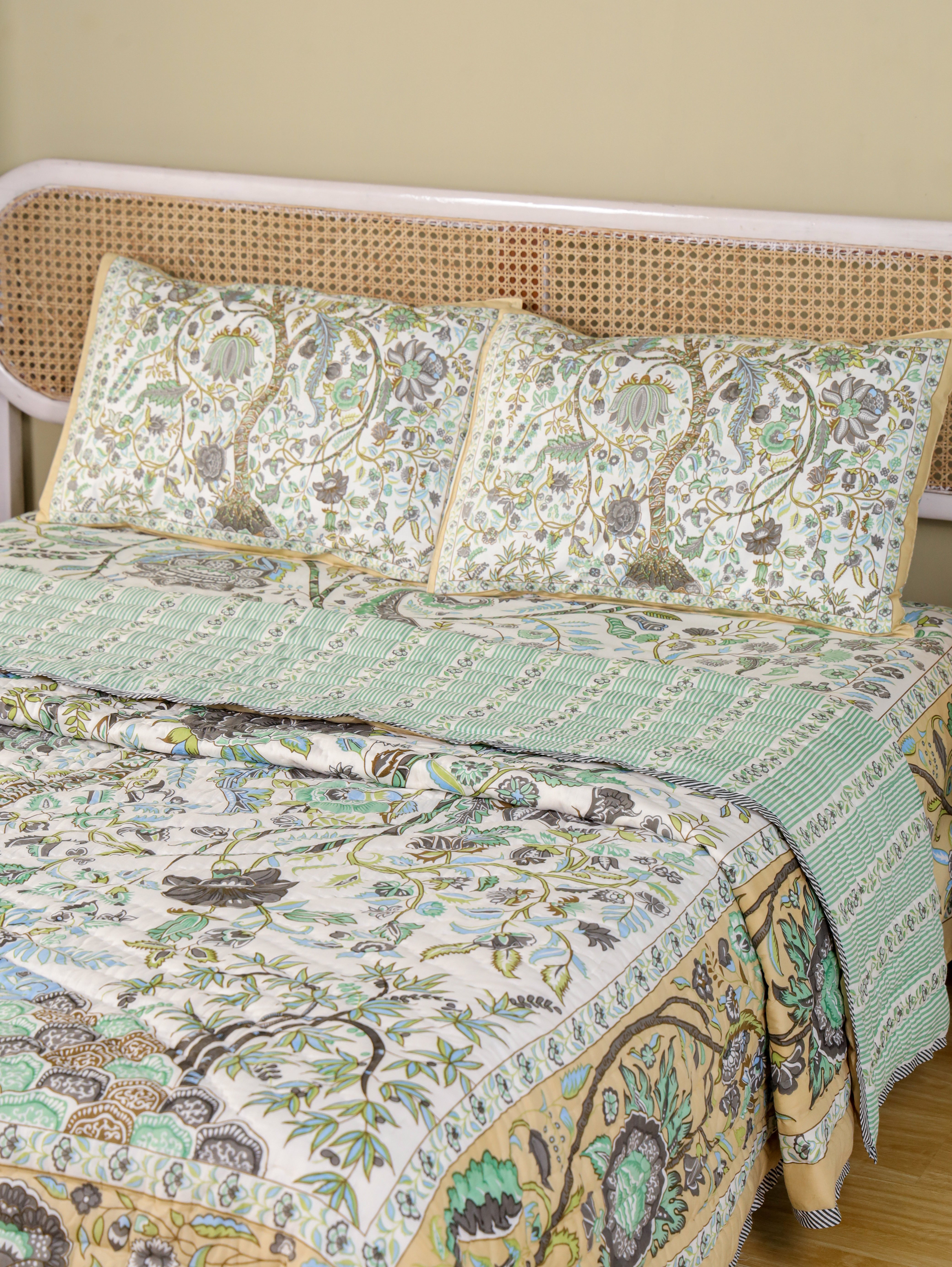Tree of Life Beige & Green - 4 Pcs- Bedsheet, Katha & Pillow covers Set