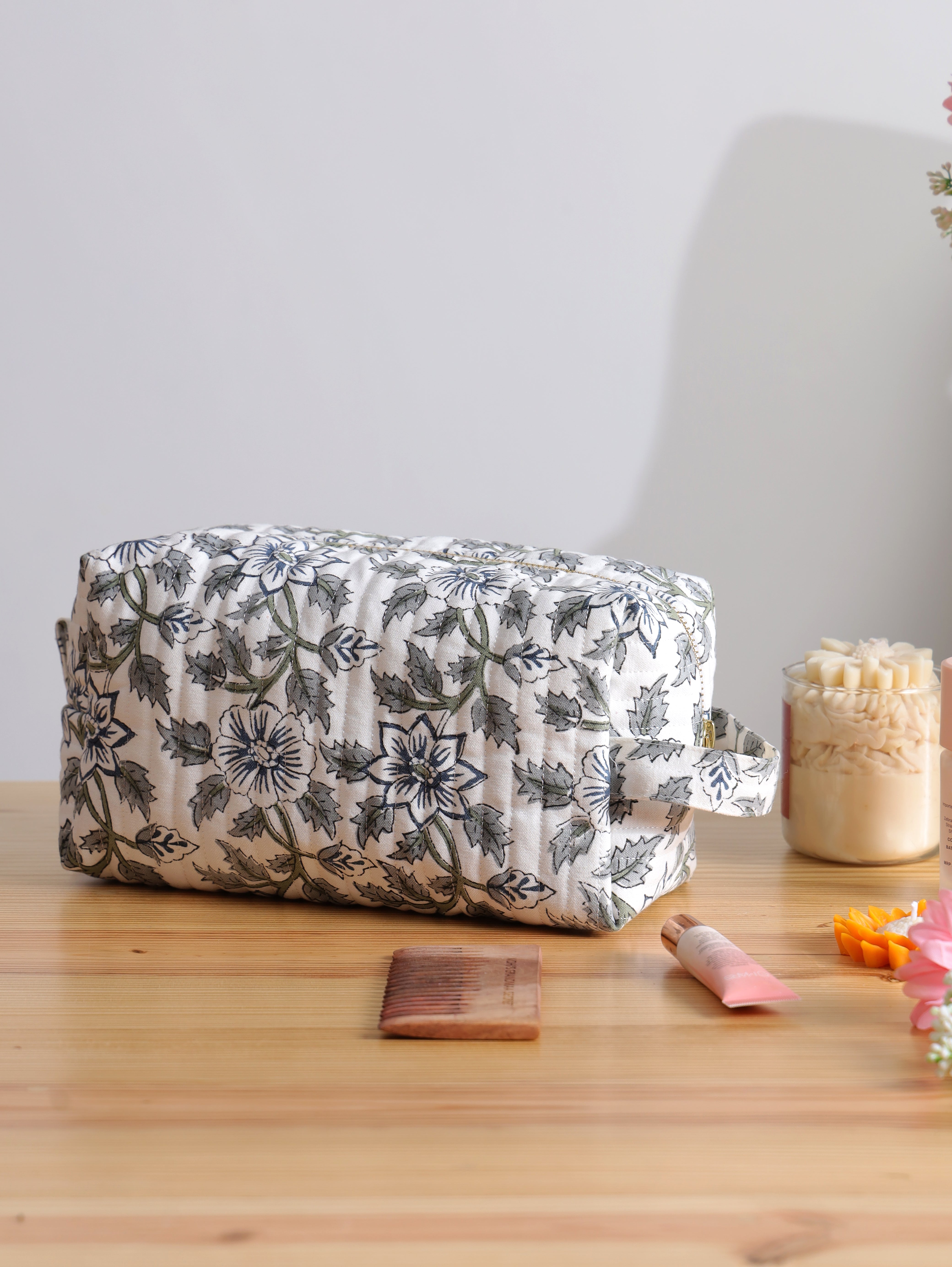 A sweet and unique range of travel/make-up bags, showcasing a harmony of colours, desires, and moods. Designed in house and hand block printed and with love and care by artisans in Jaipur, they are as practical as they are pretty.