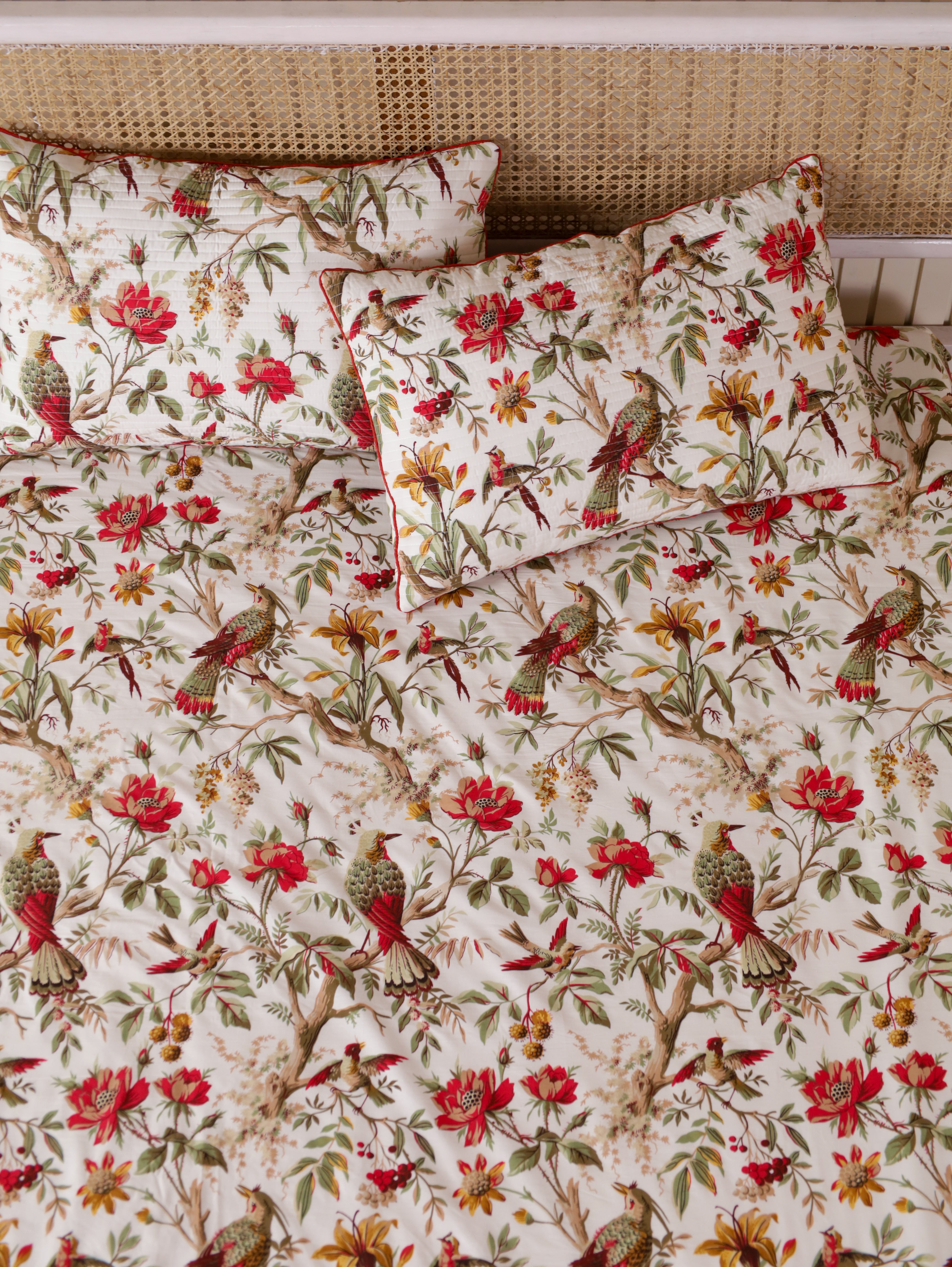 Indulge in the beauty of nature with our Red Birds & Floral Bed sheet Set. This exquisite set captures the elegance of delicate birds amidst a tapestry of vibrant florals, all rendered in a harmonious blend of mustard and red hues. It consists of bed sheet & quilted pillow covers.