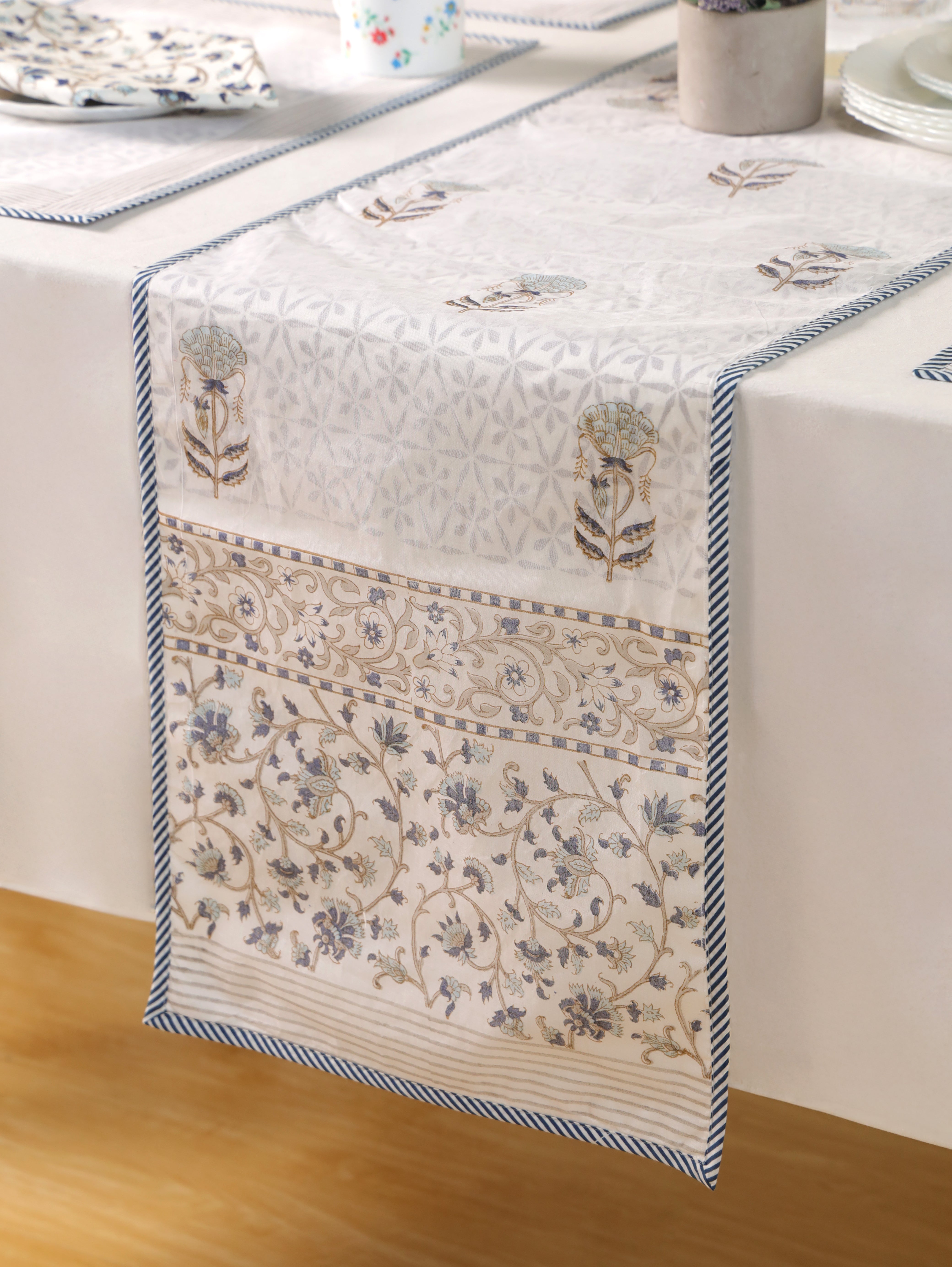 A layered expression of craft—hand-block printed canvas cotton topped with airy organza. Subtle geometry beneath, flowing florals above, designed to bring softness and sophistication to your table.