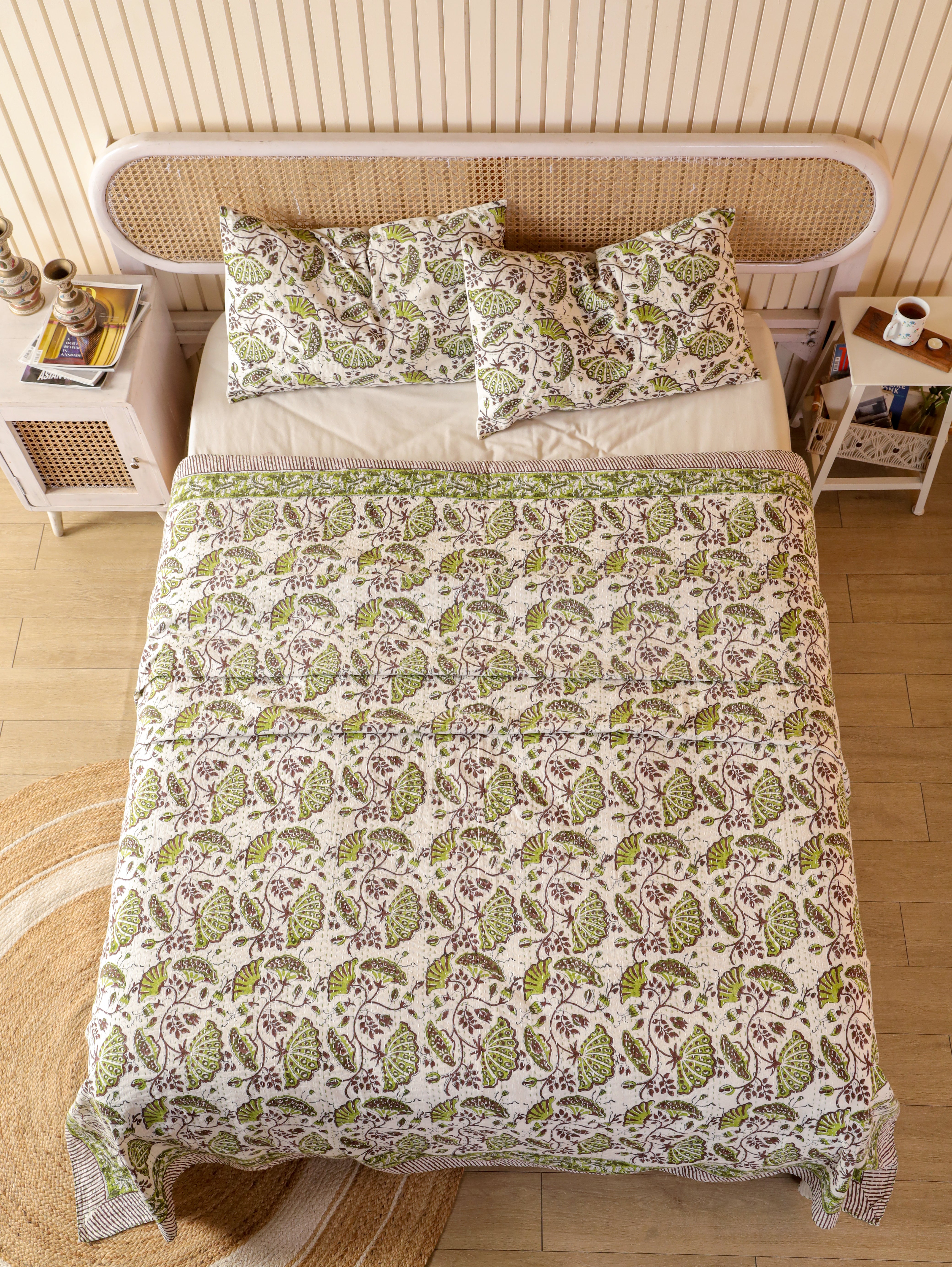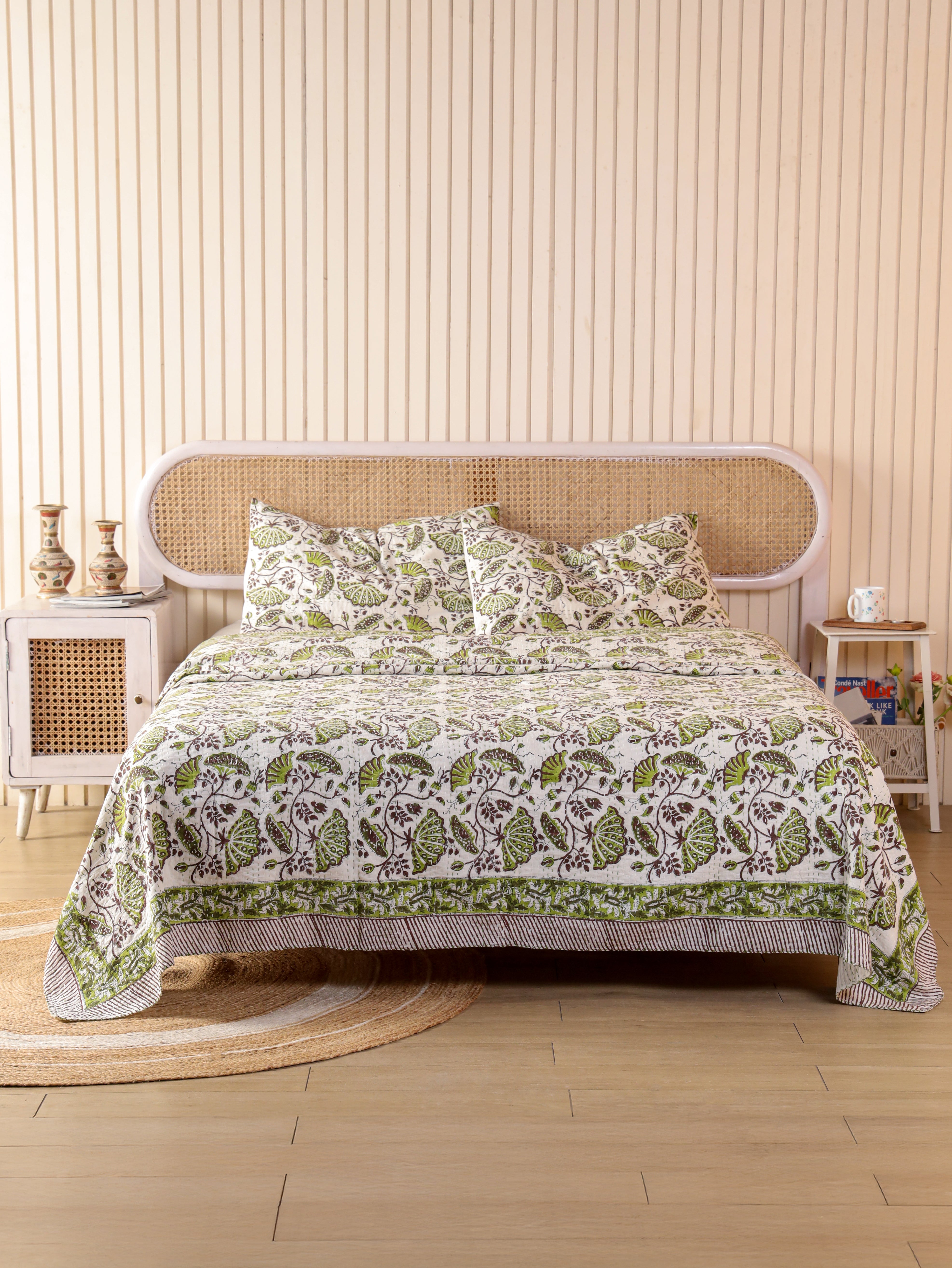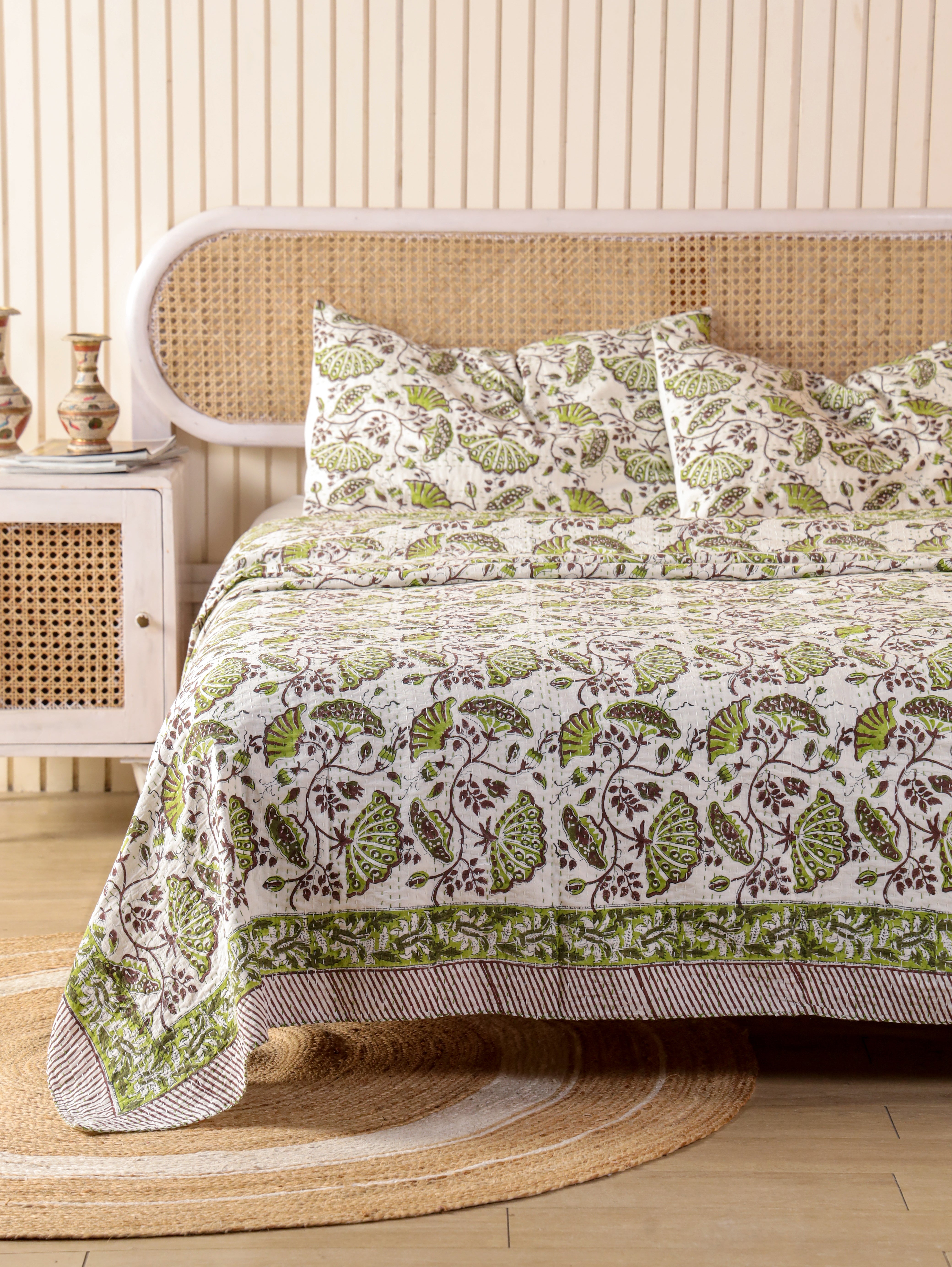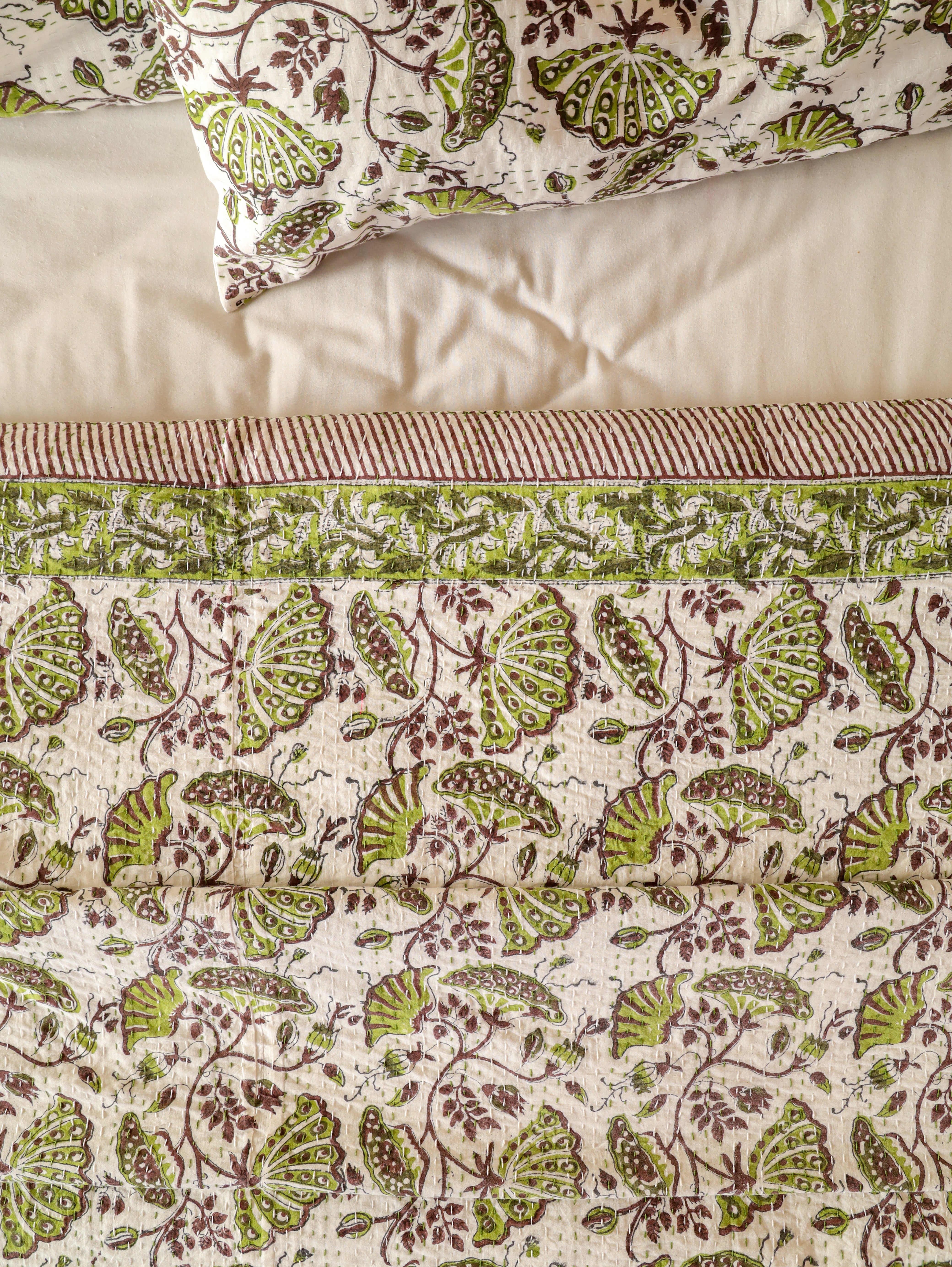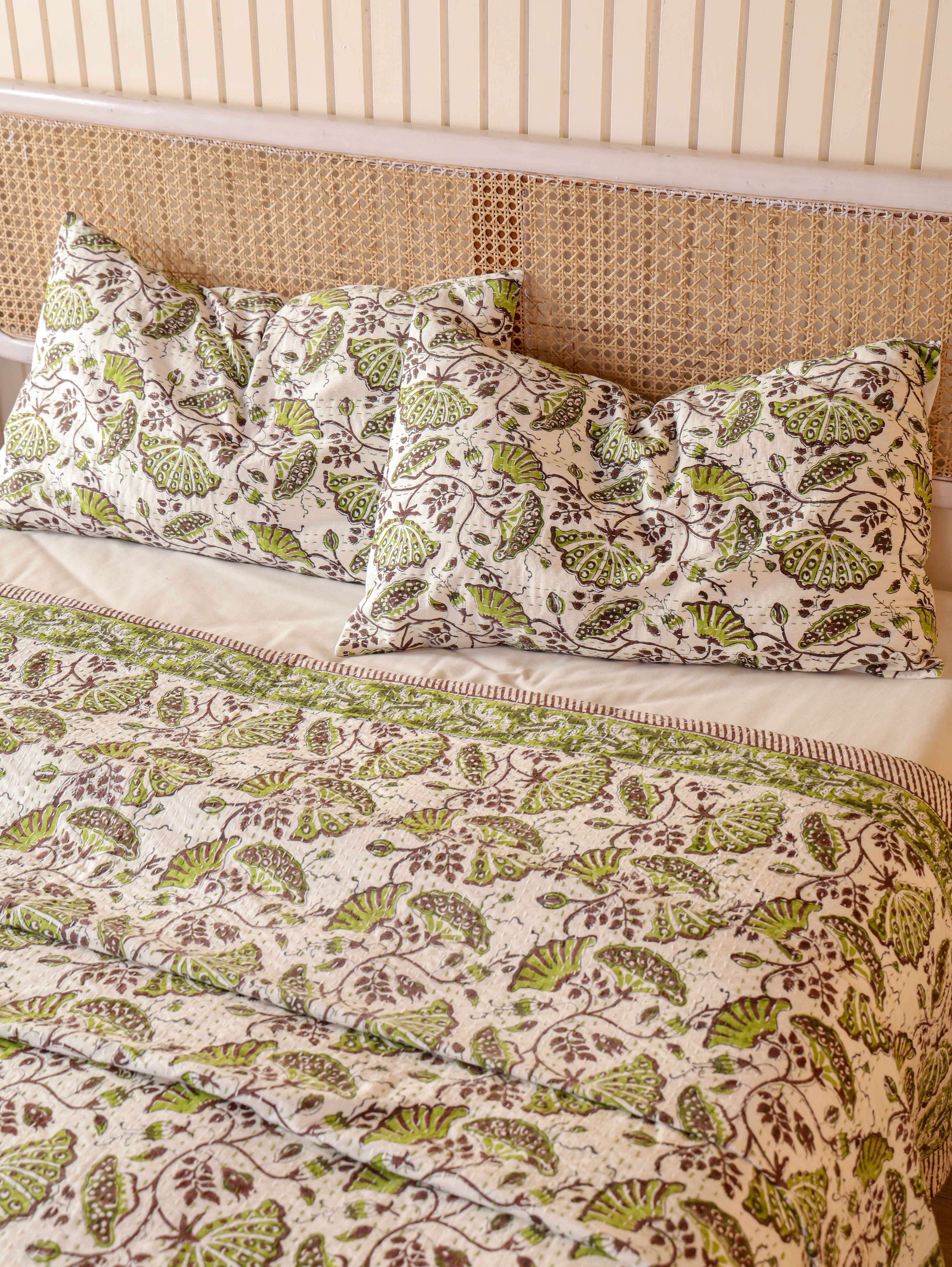 Our hand stitched Kantha can bring any room alive with its vivid colours, stunning print and hand-stitched embroidery. This lightweight quilt is made from two thin layers of cotton sewn together with a traditional type of running stitch called "kantha".