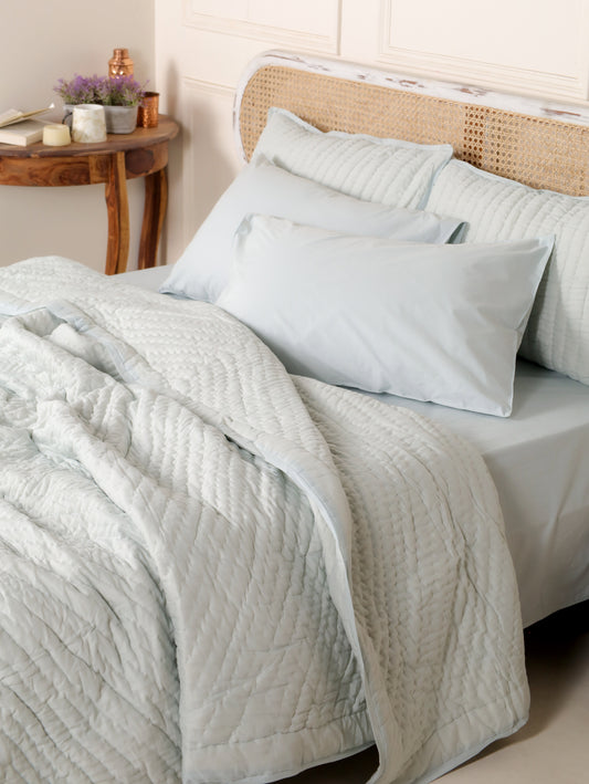 Complete set with bed sheet, Razai and 4 pillowcases. Razai is suitable for summers with ac and during light winters.
