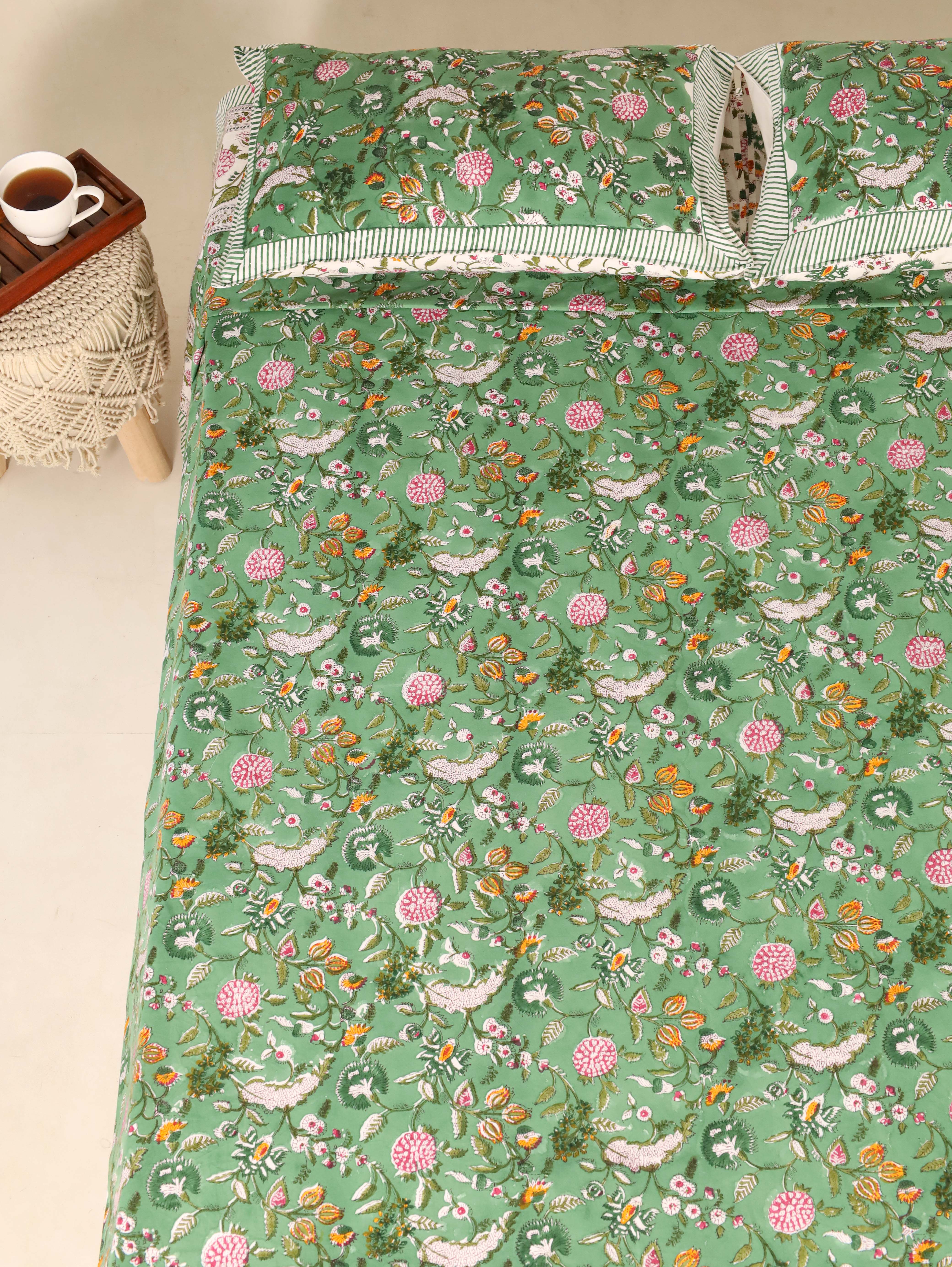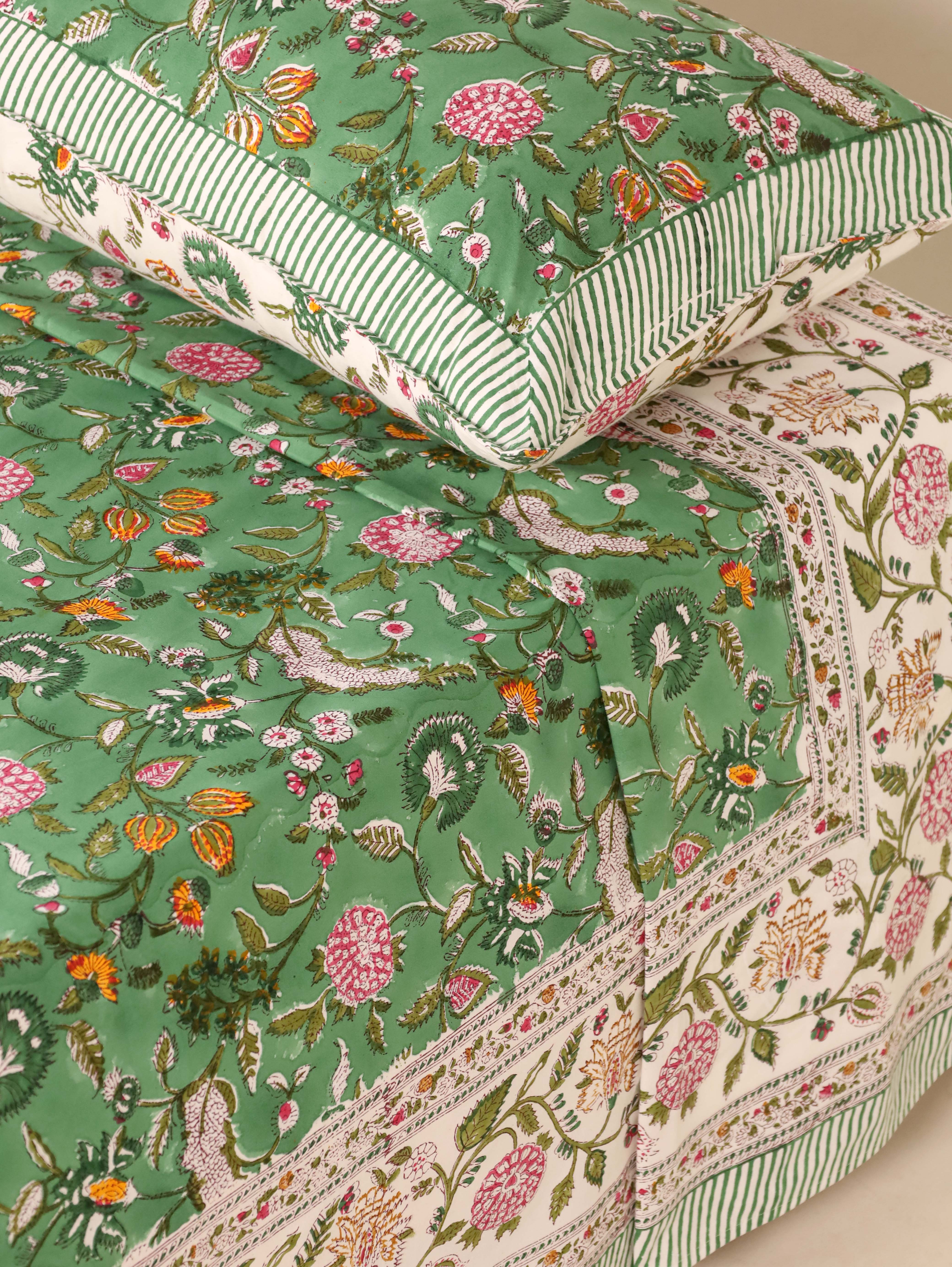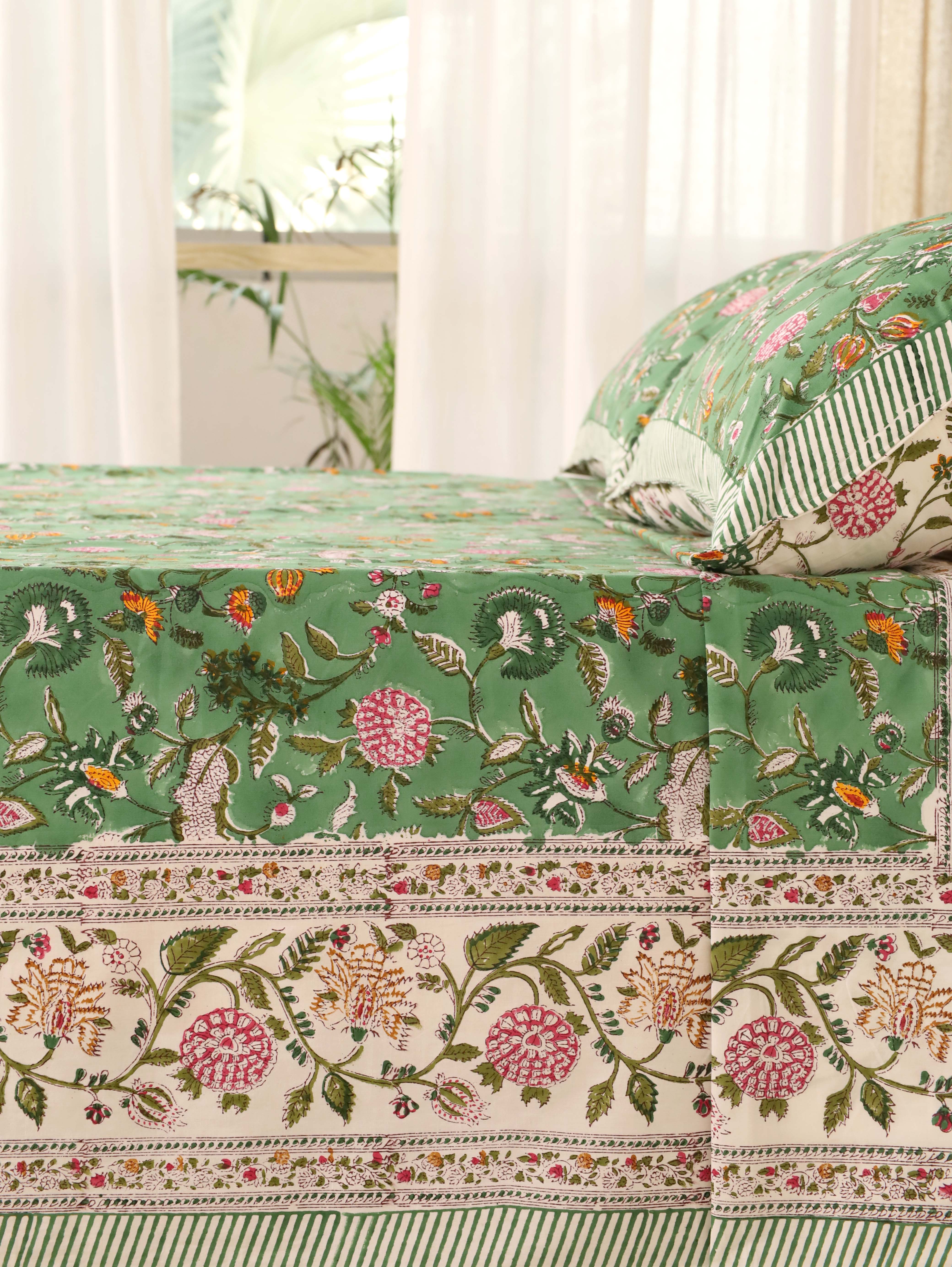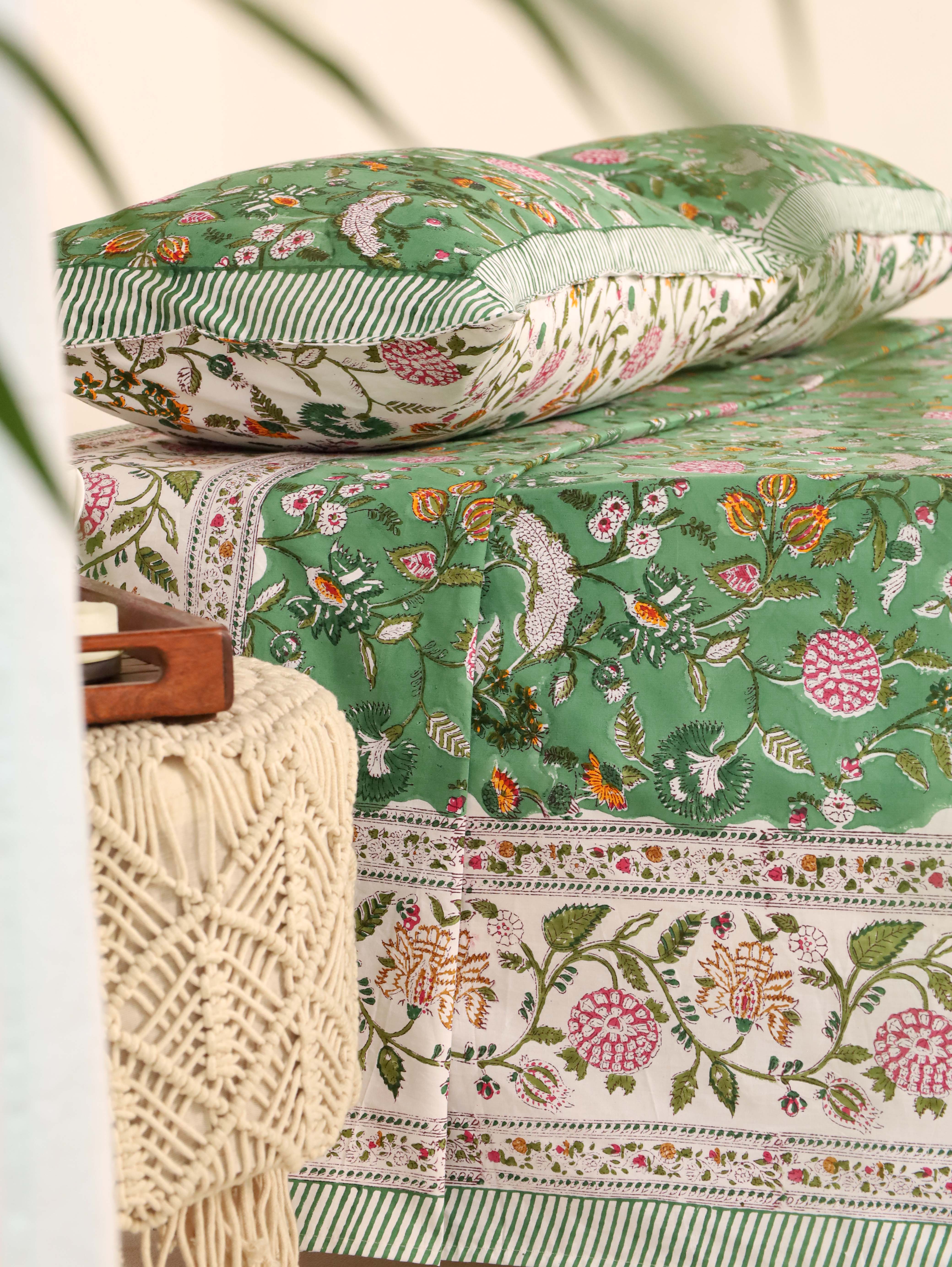 A fresh and artful bedsheet in beautiful forest green base with hand block printed floral blossoms. Bursting with colours, this bed sheet adds a charming and breezy look to any room.