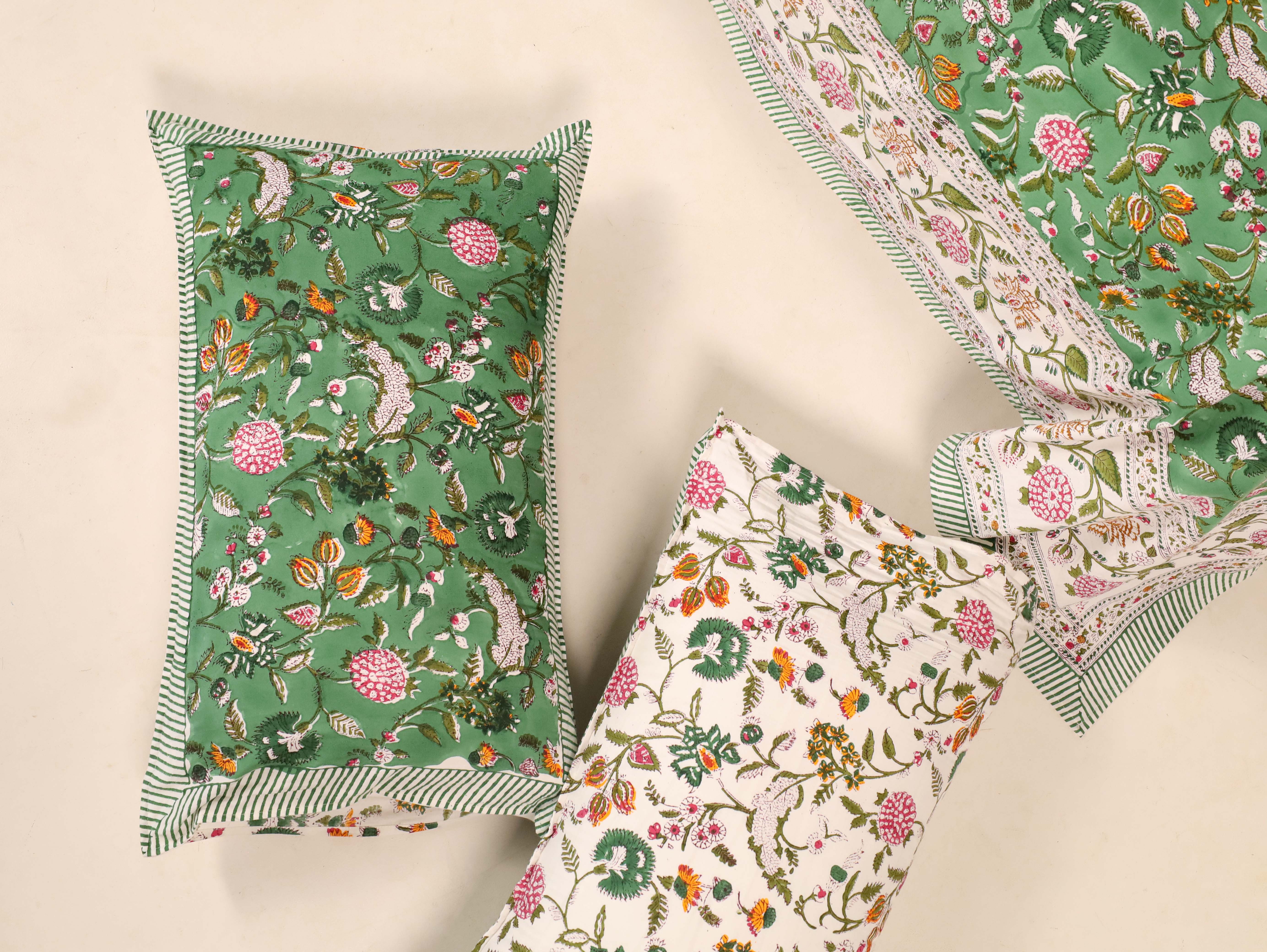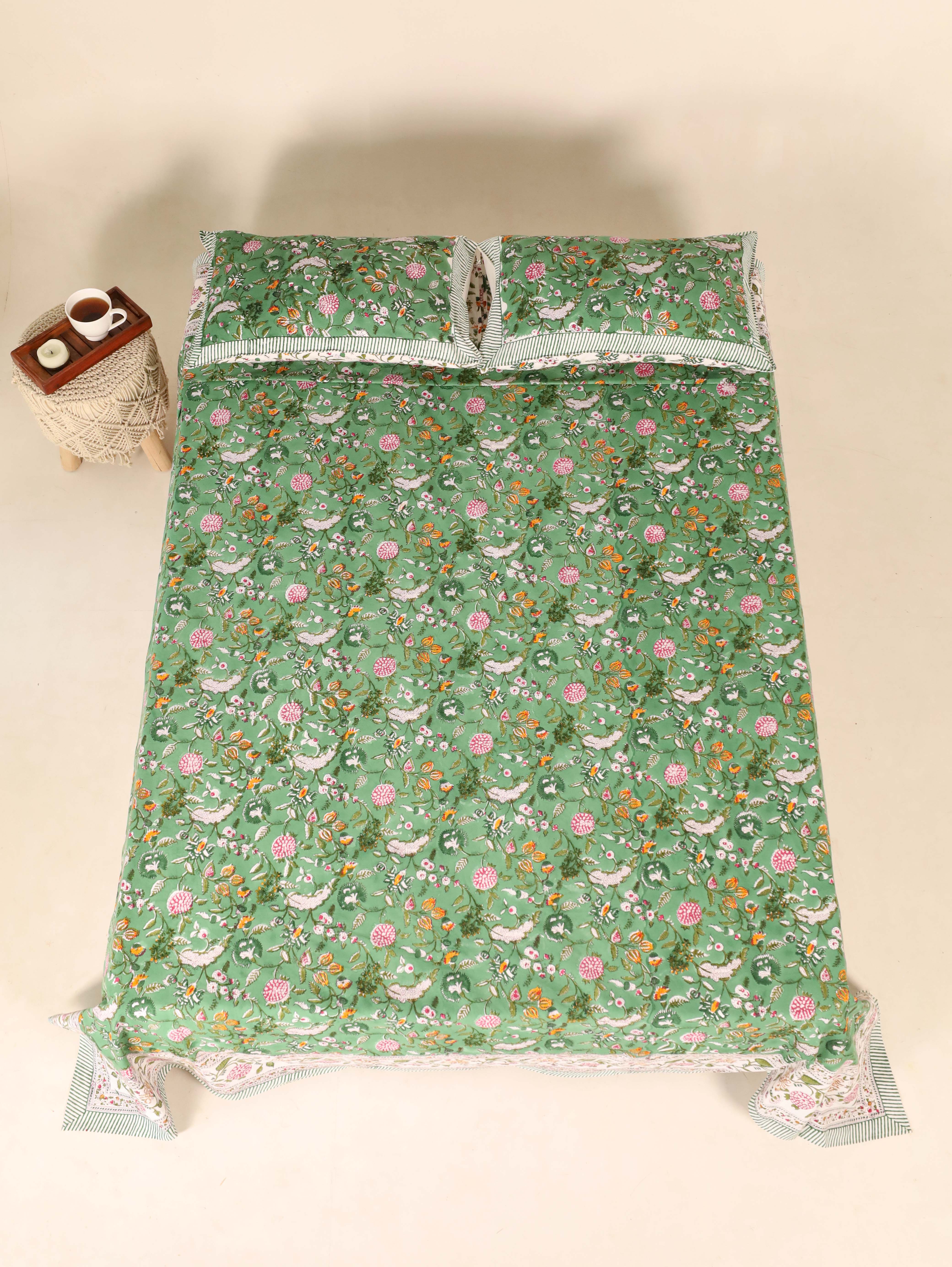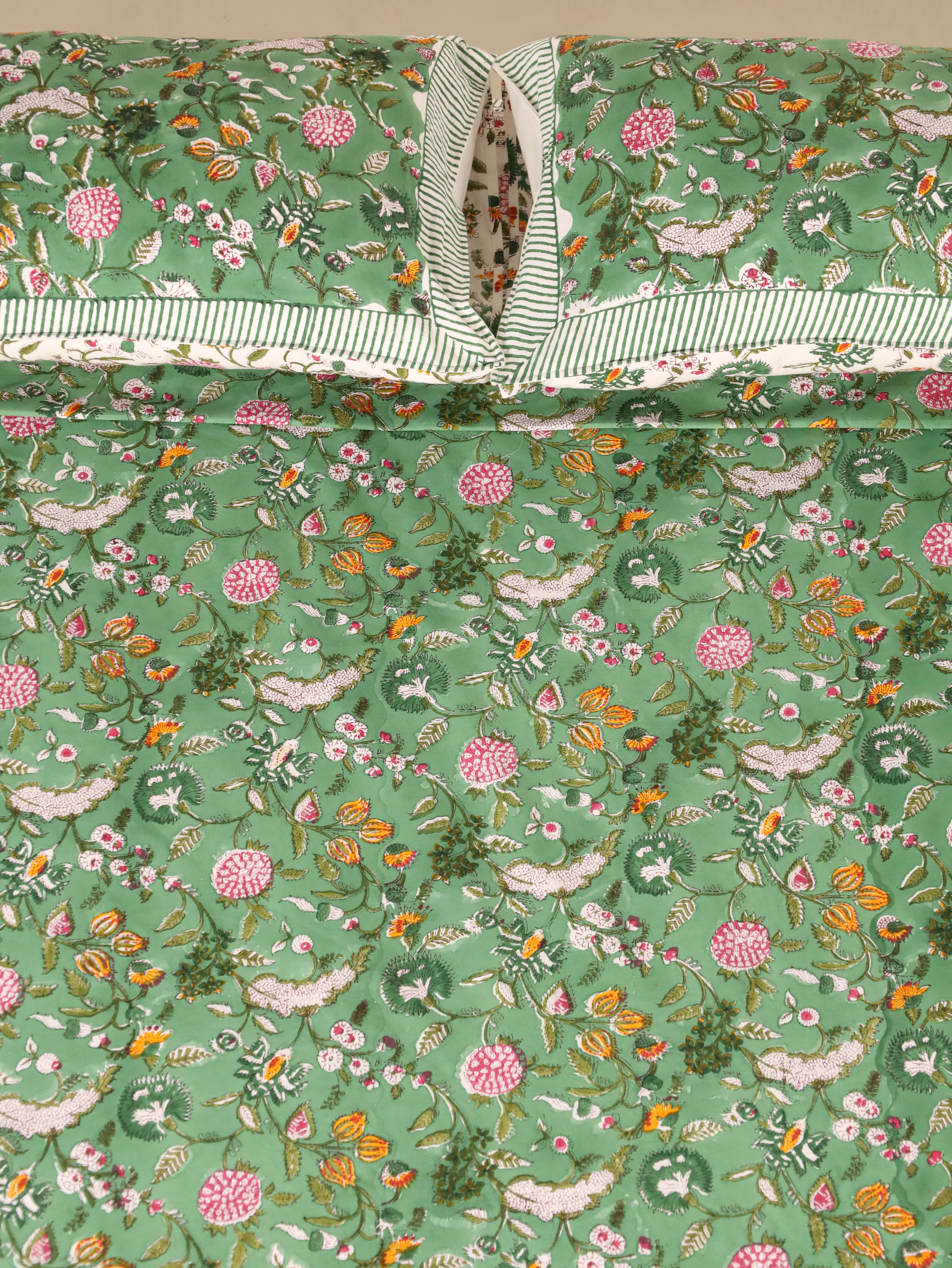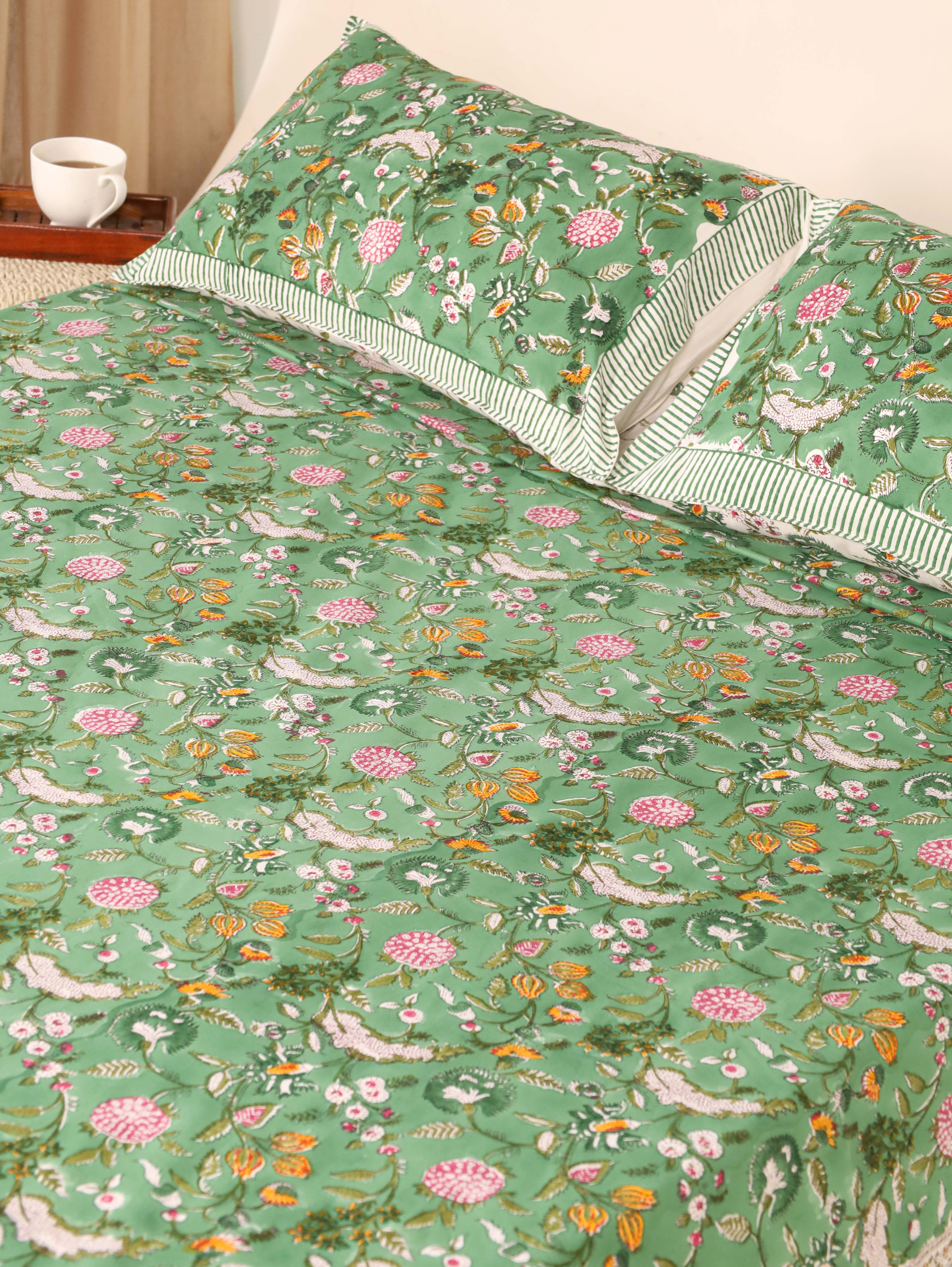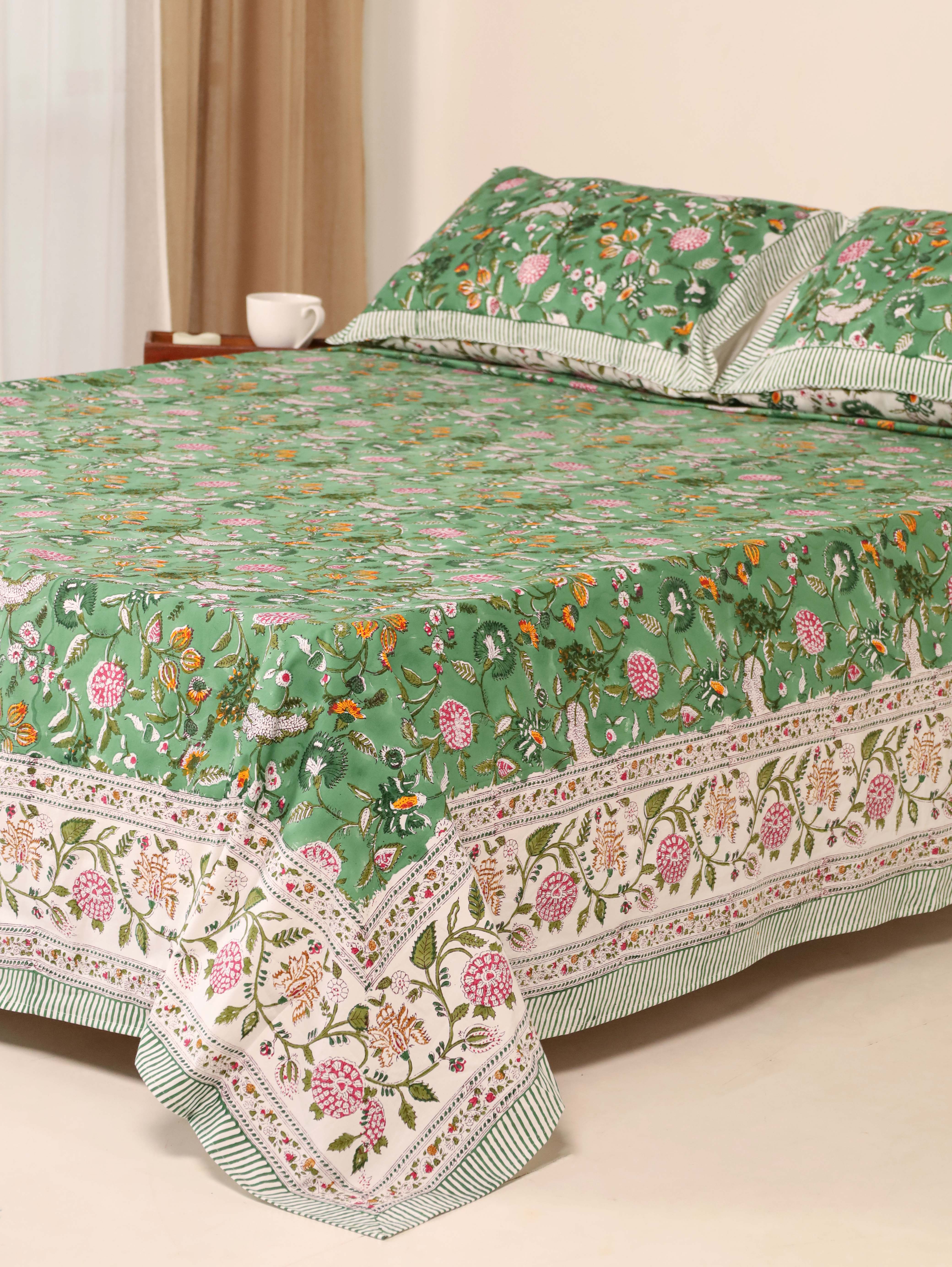 A fresh and artful bedsheet in beautiful forest green base with hand block printed floral blossoms. Bursting with colours, this bed sheet adds a charming and breezy look to any room.