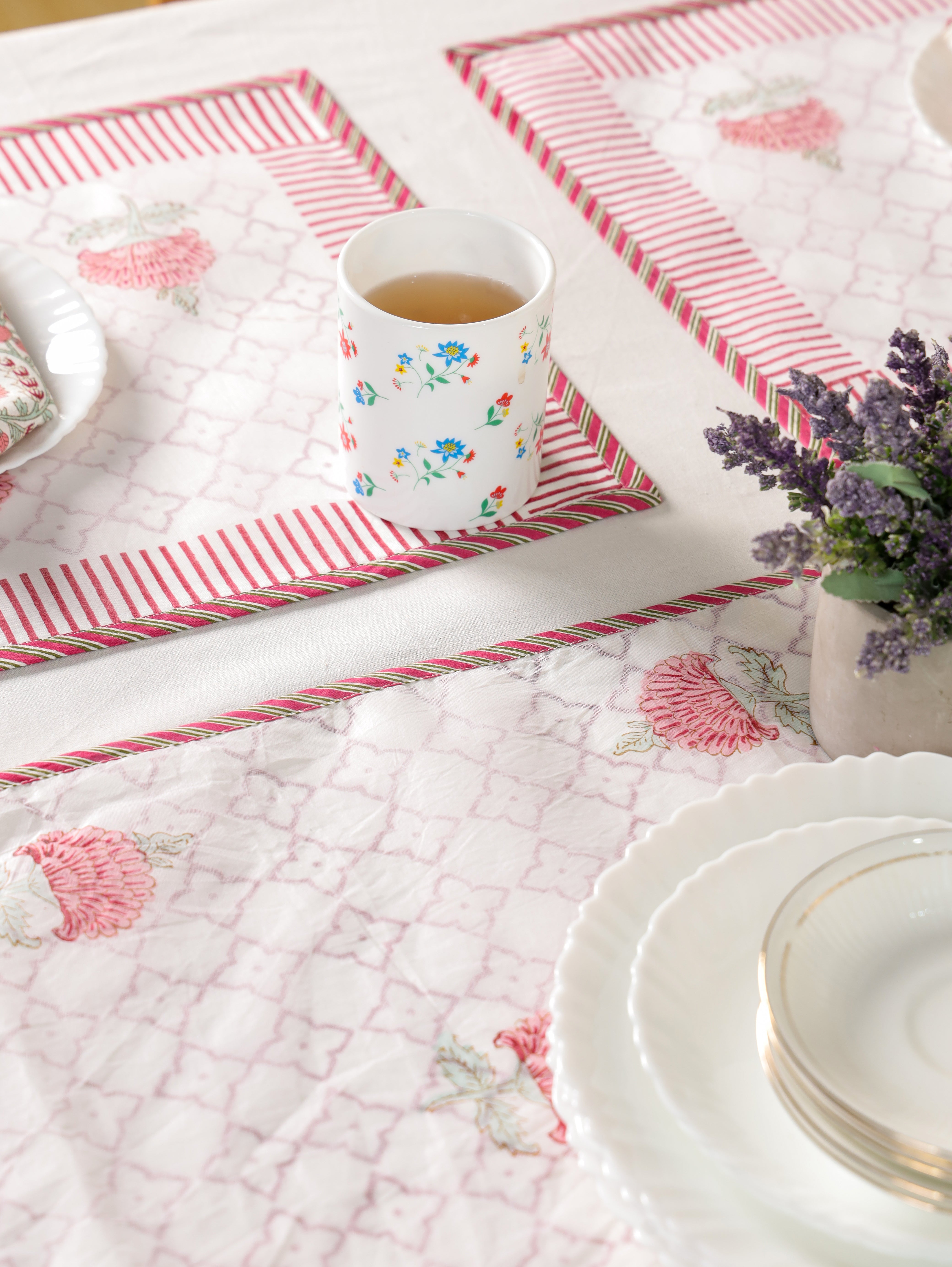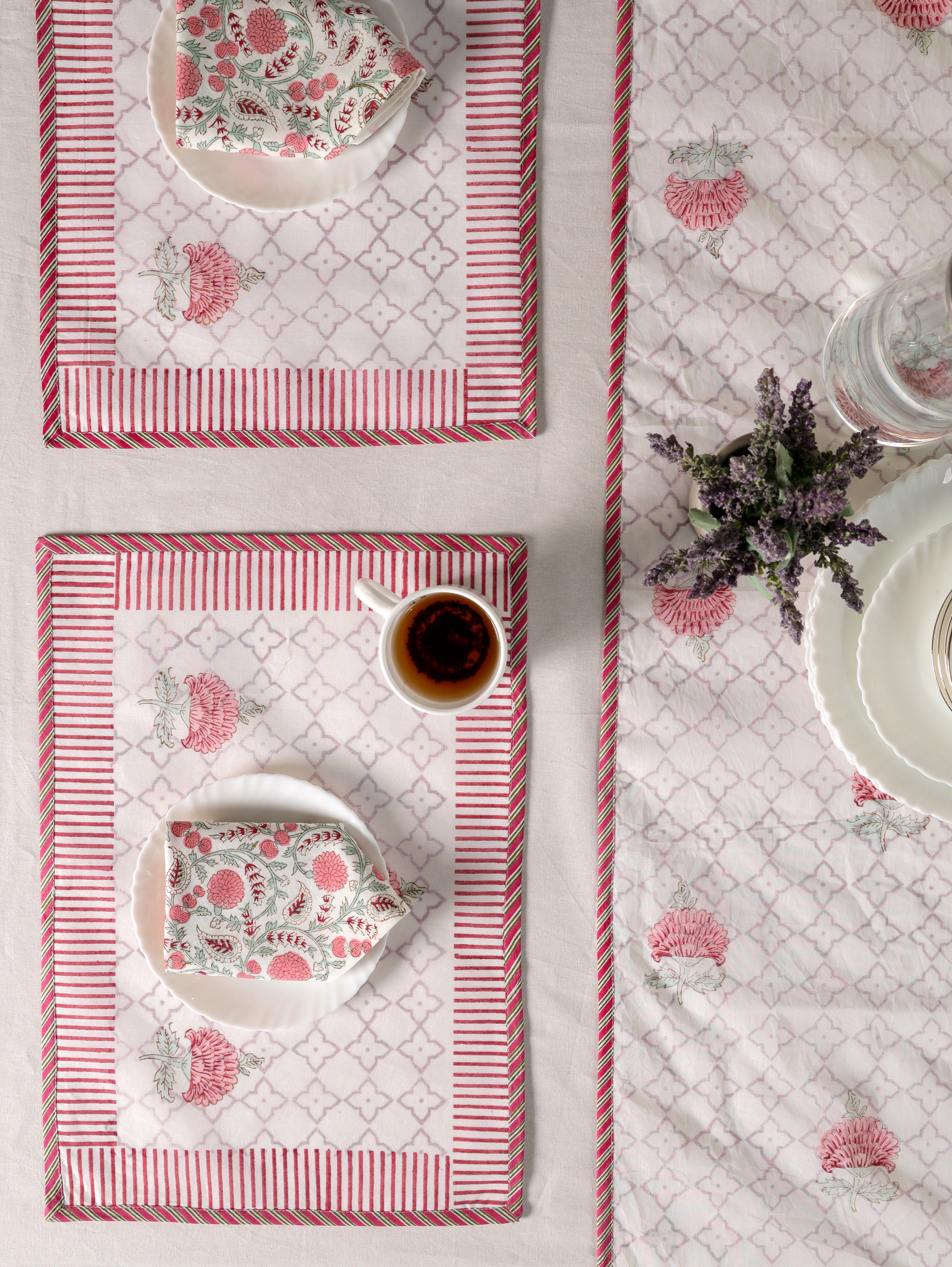 Designed for slow gatherings and beautiful tables, this layered table linen collection pairs hand-block printed canvas cotton with an ethereal organza finish. The interplay of structure and softness lends a dreamy charm—perfect for elevating everyday dining or special occasions.