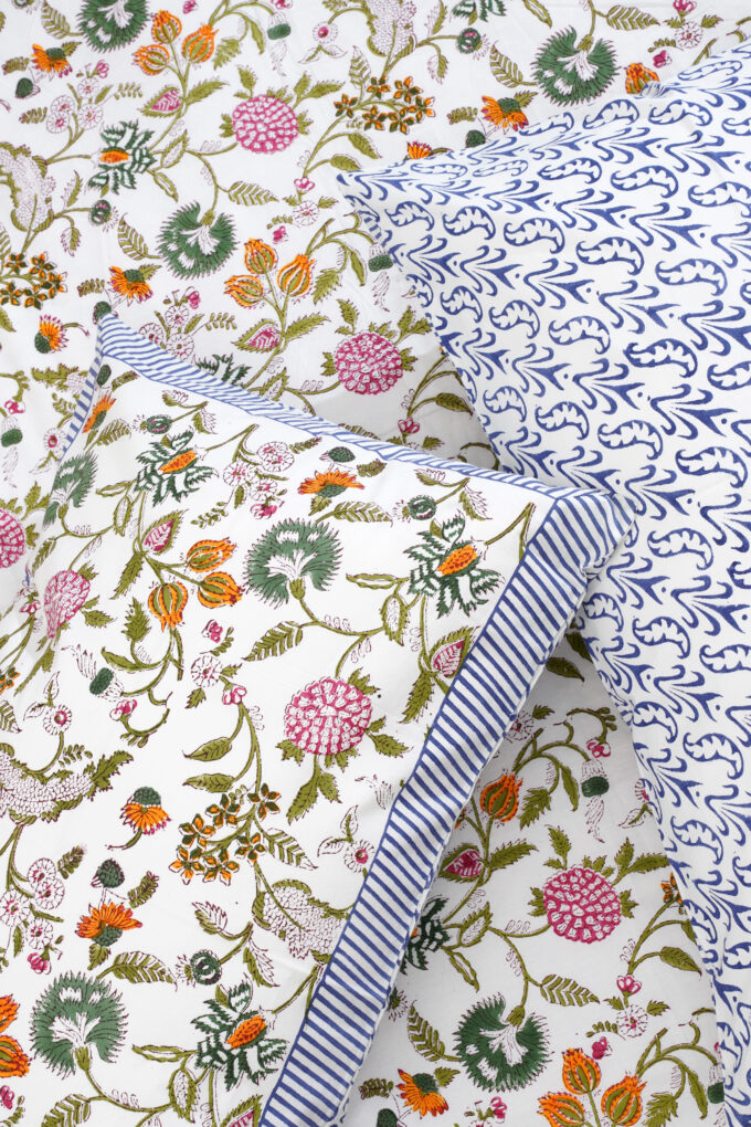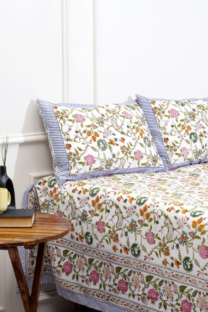 This hand block printed bedsheet is full of vibrant colours that bring out intricate details in the flowers, petals and buds.