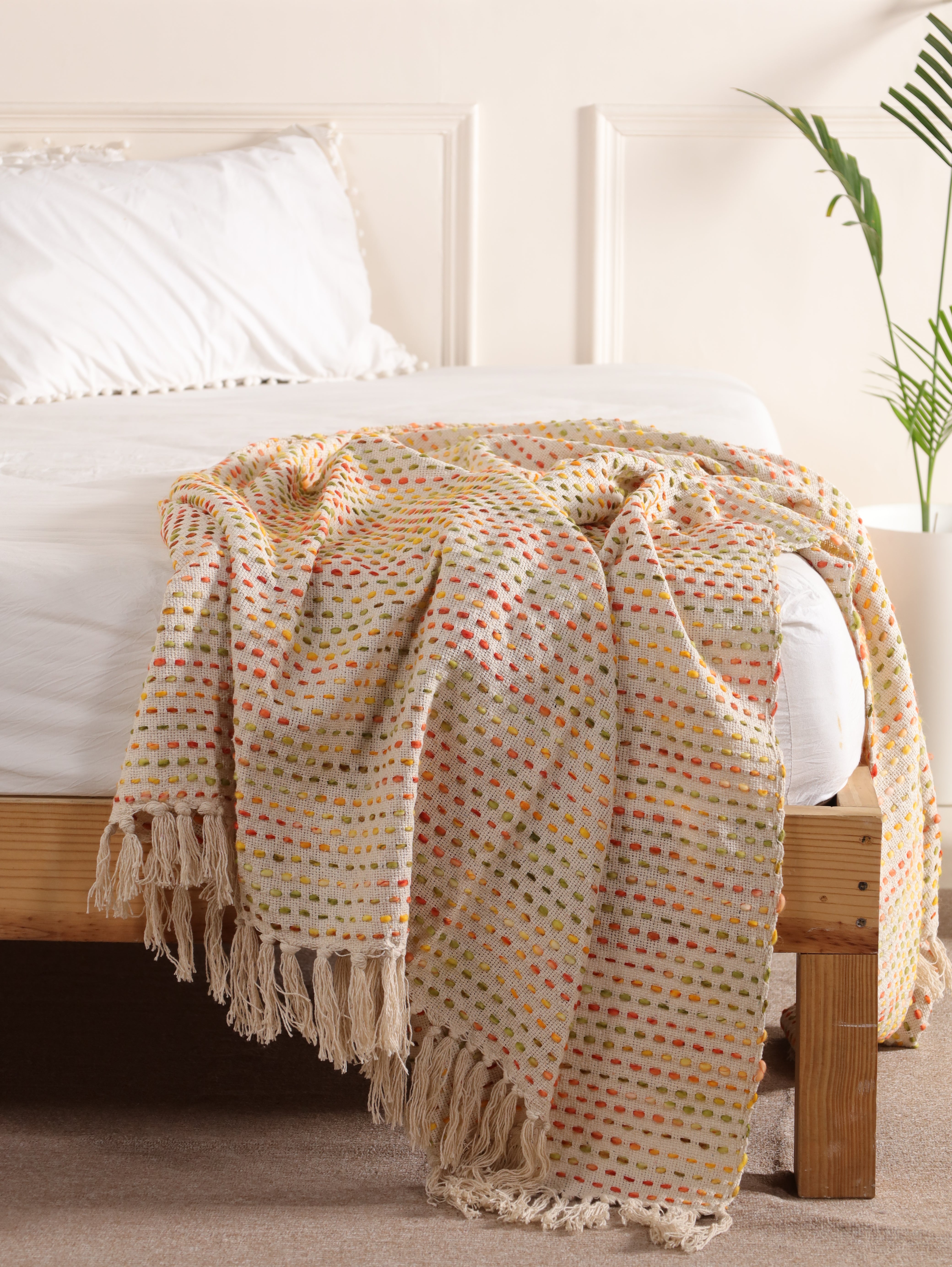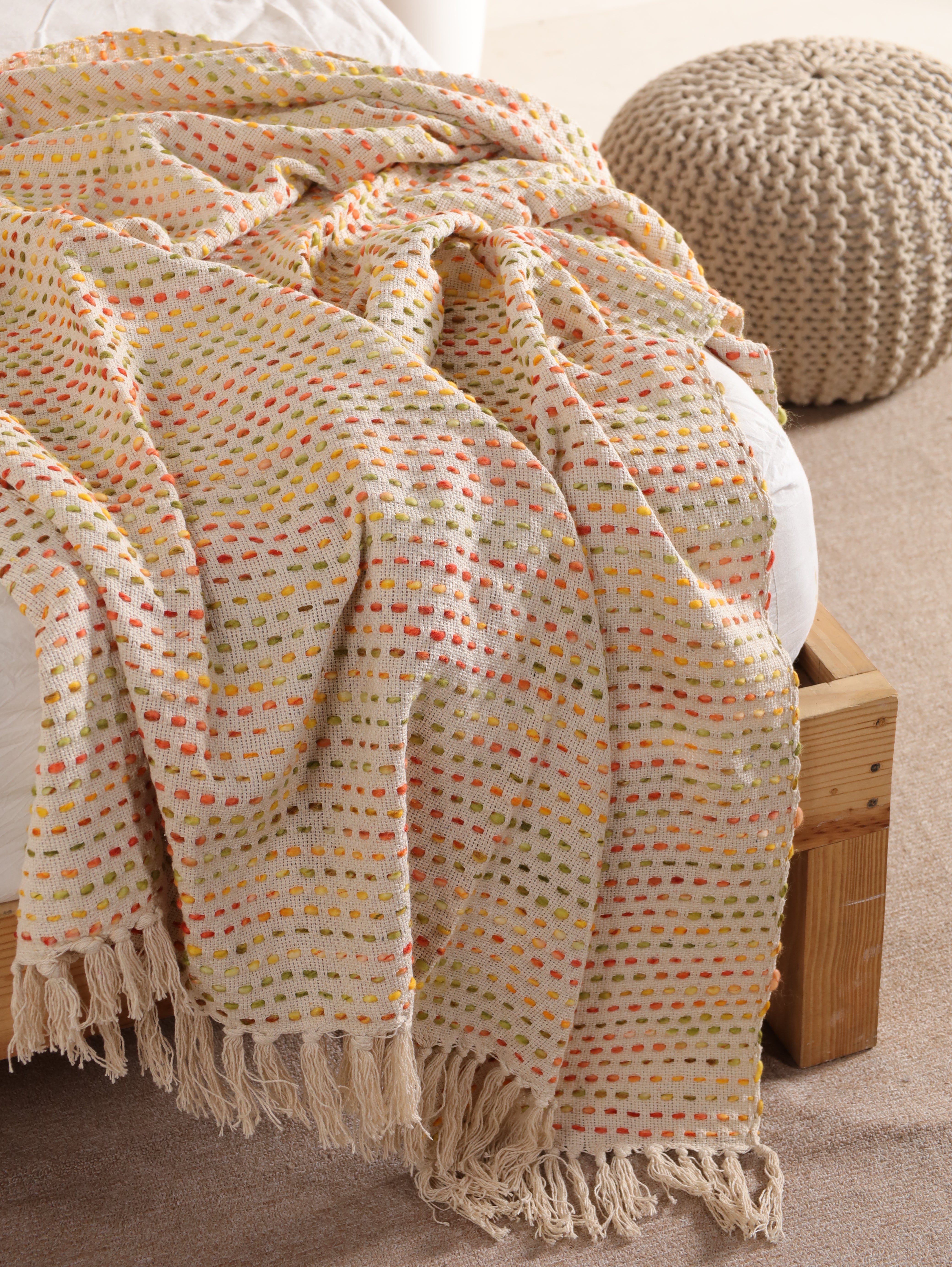 This beautiful throw is completely hand loomed with beautiful multi coloured wool. Made from natural unprocessed and 100% hand-spun and handwoven cotton. It looks amazing over a couch, sofa, or bedding.