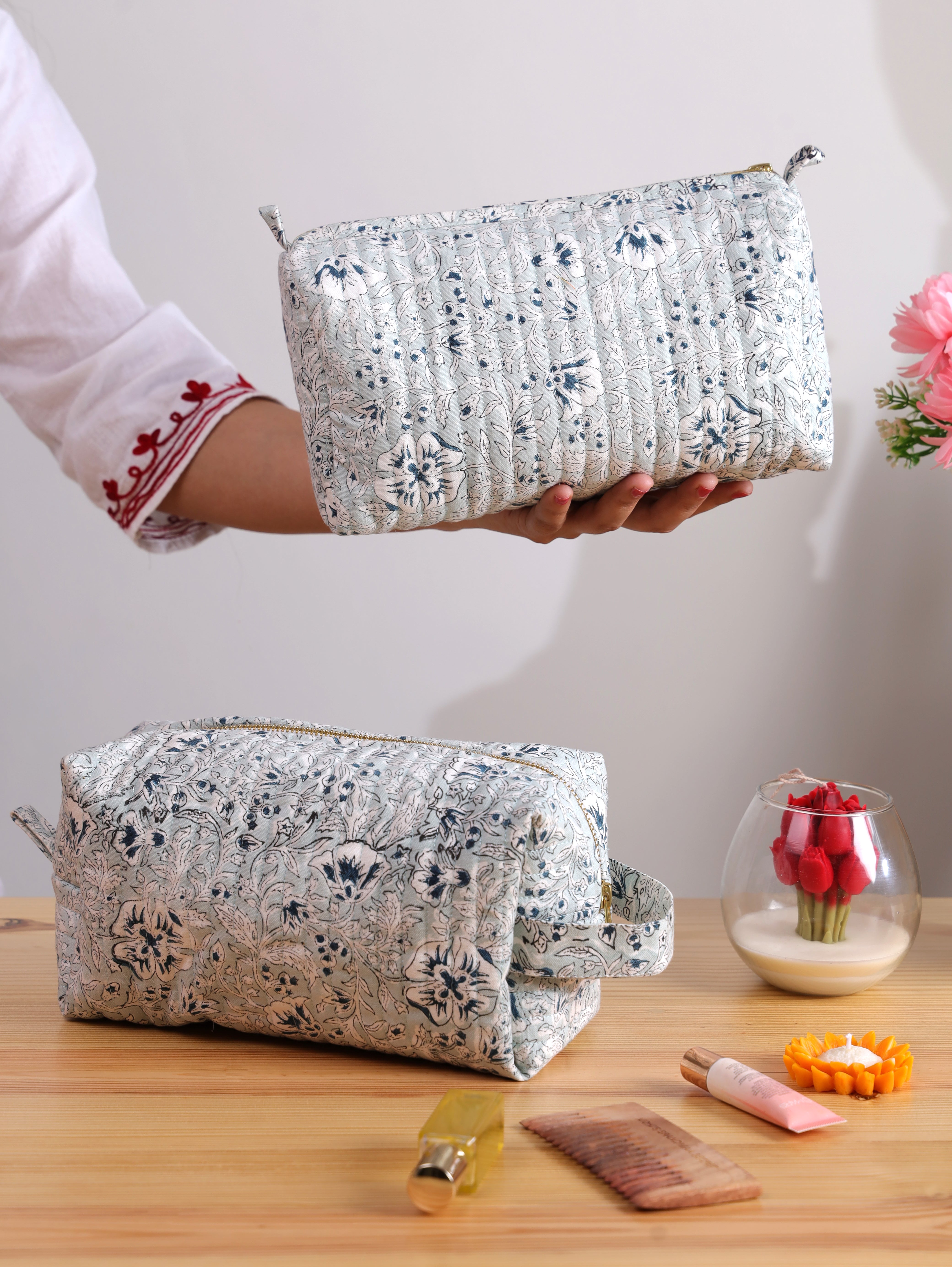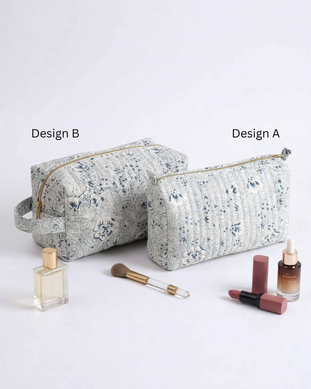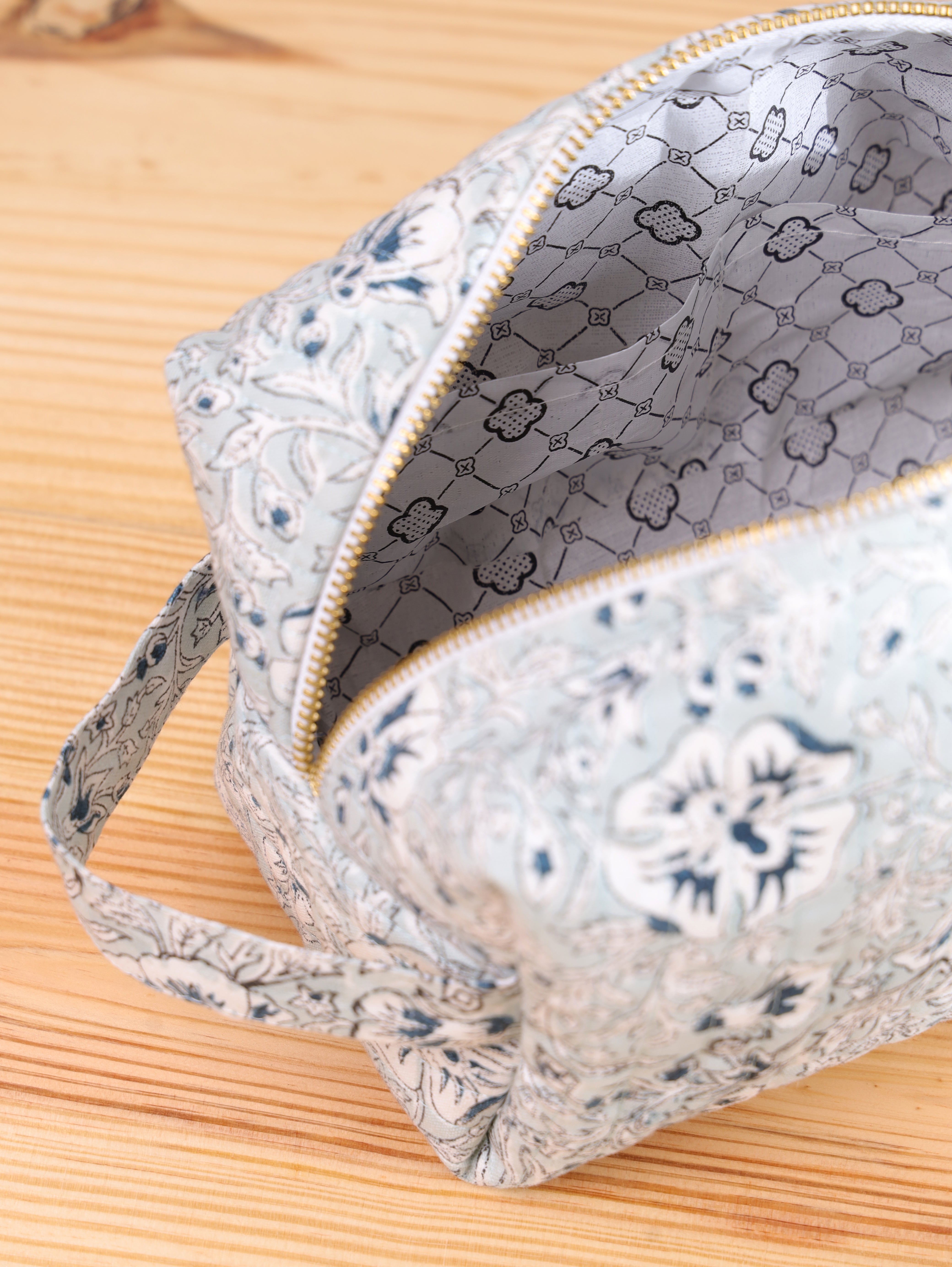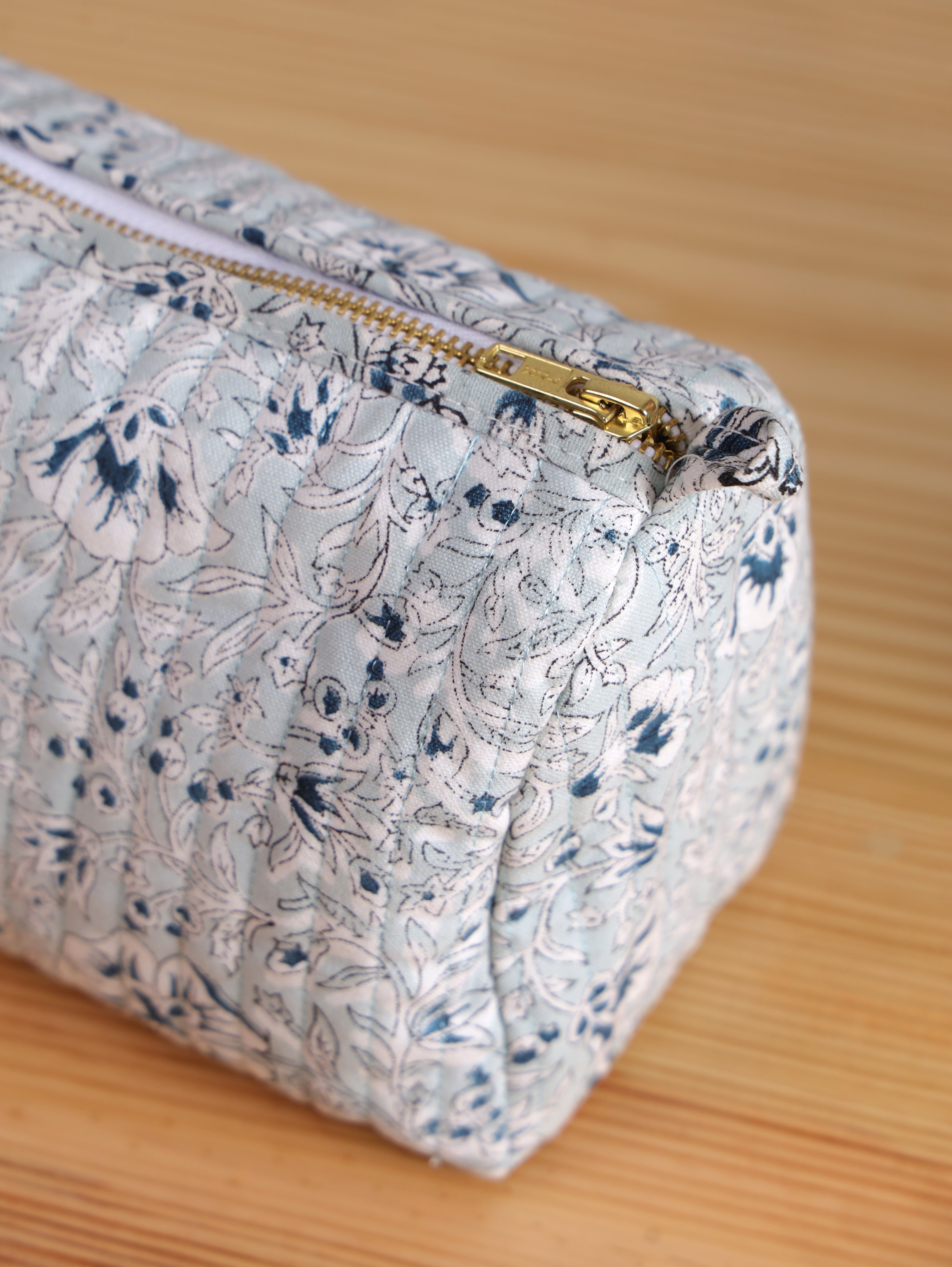 A sweet and unique range of travel/make-up bags, showcasing a harmony of colours, desires, and moods. Designed in house and hand block printed and with love and care by artisans in Jaipur, they are as practical as they are pretty.