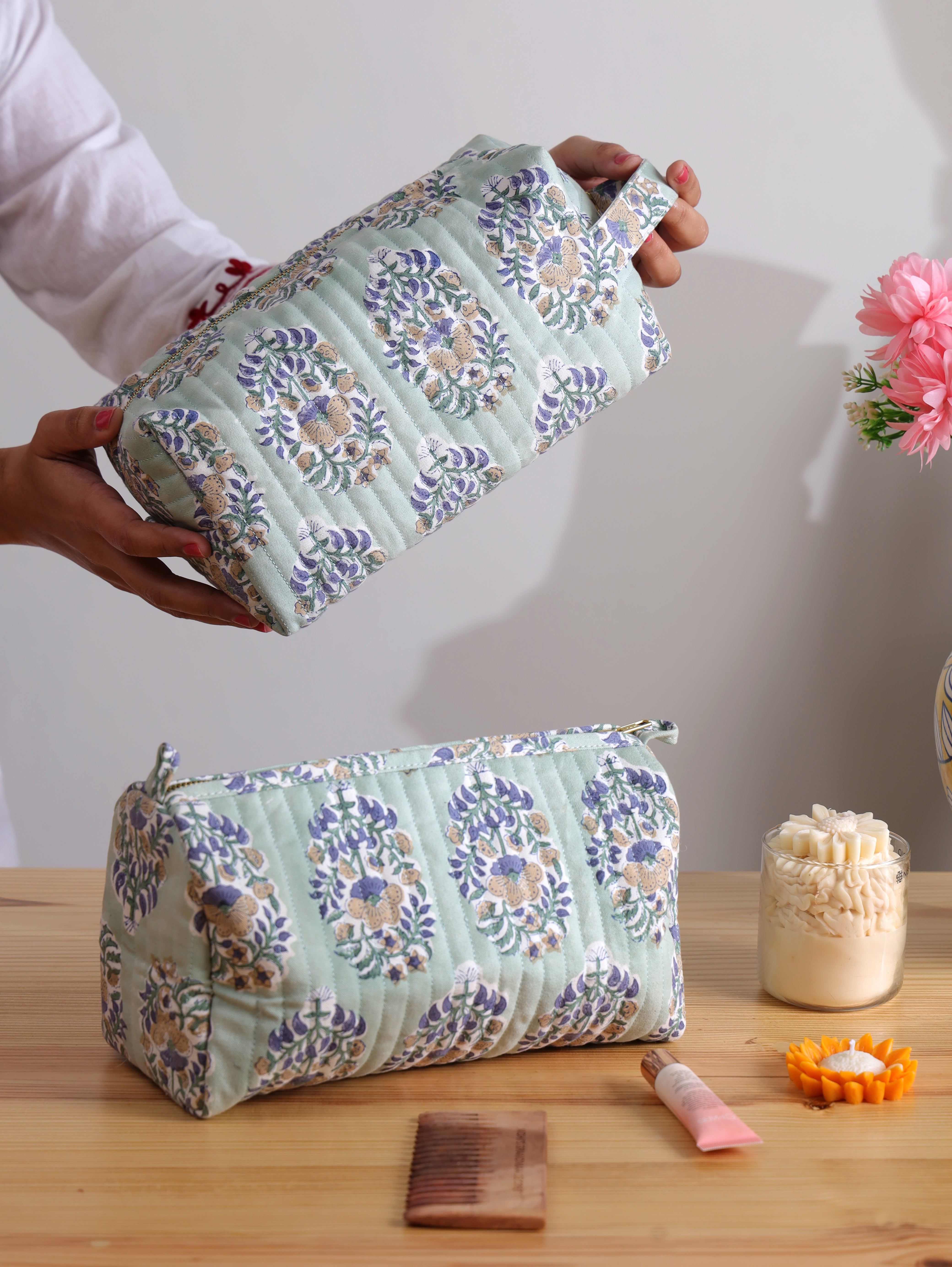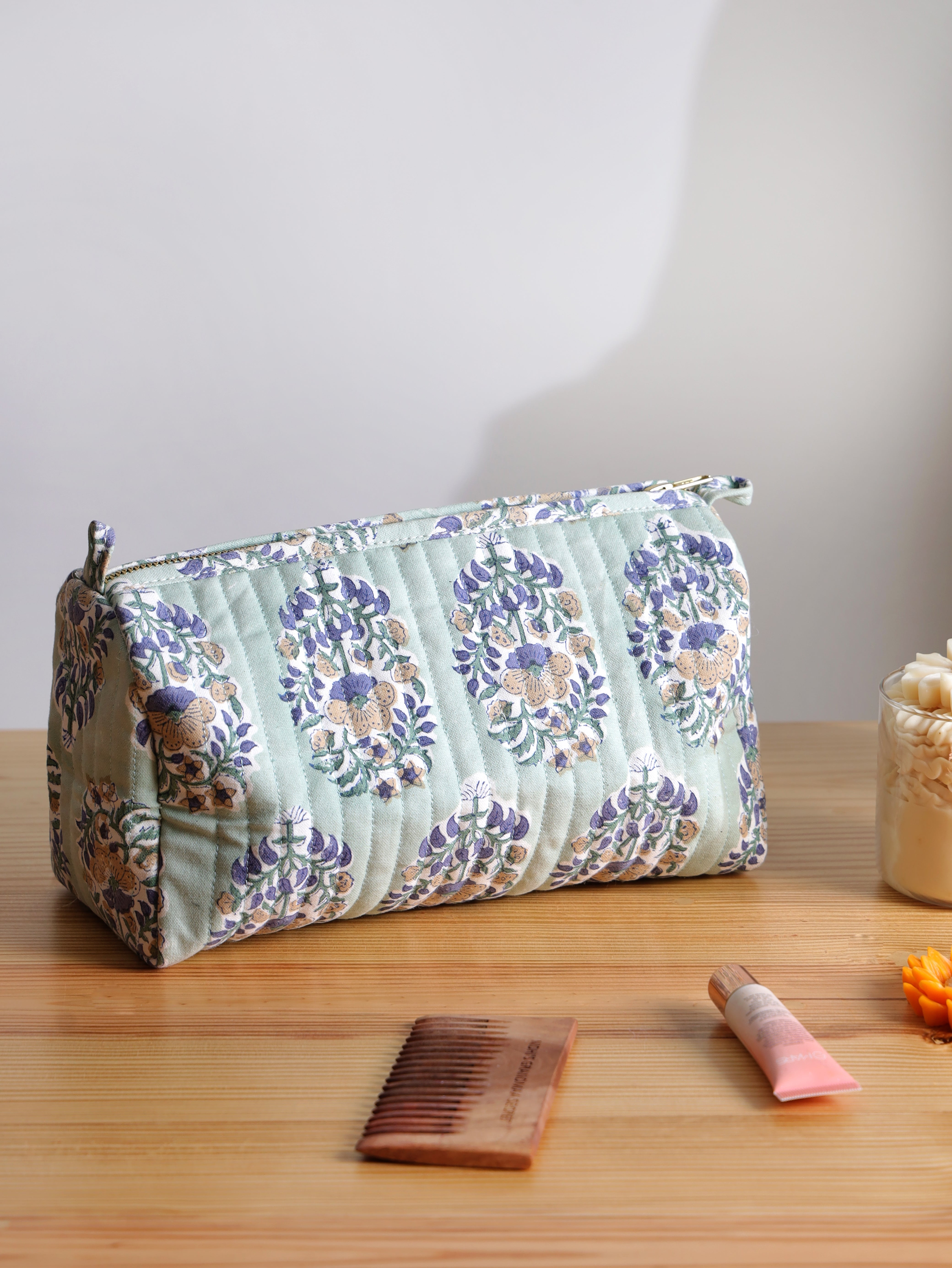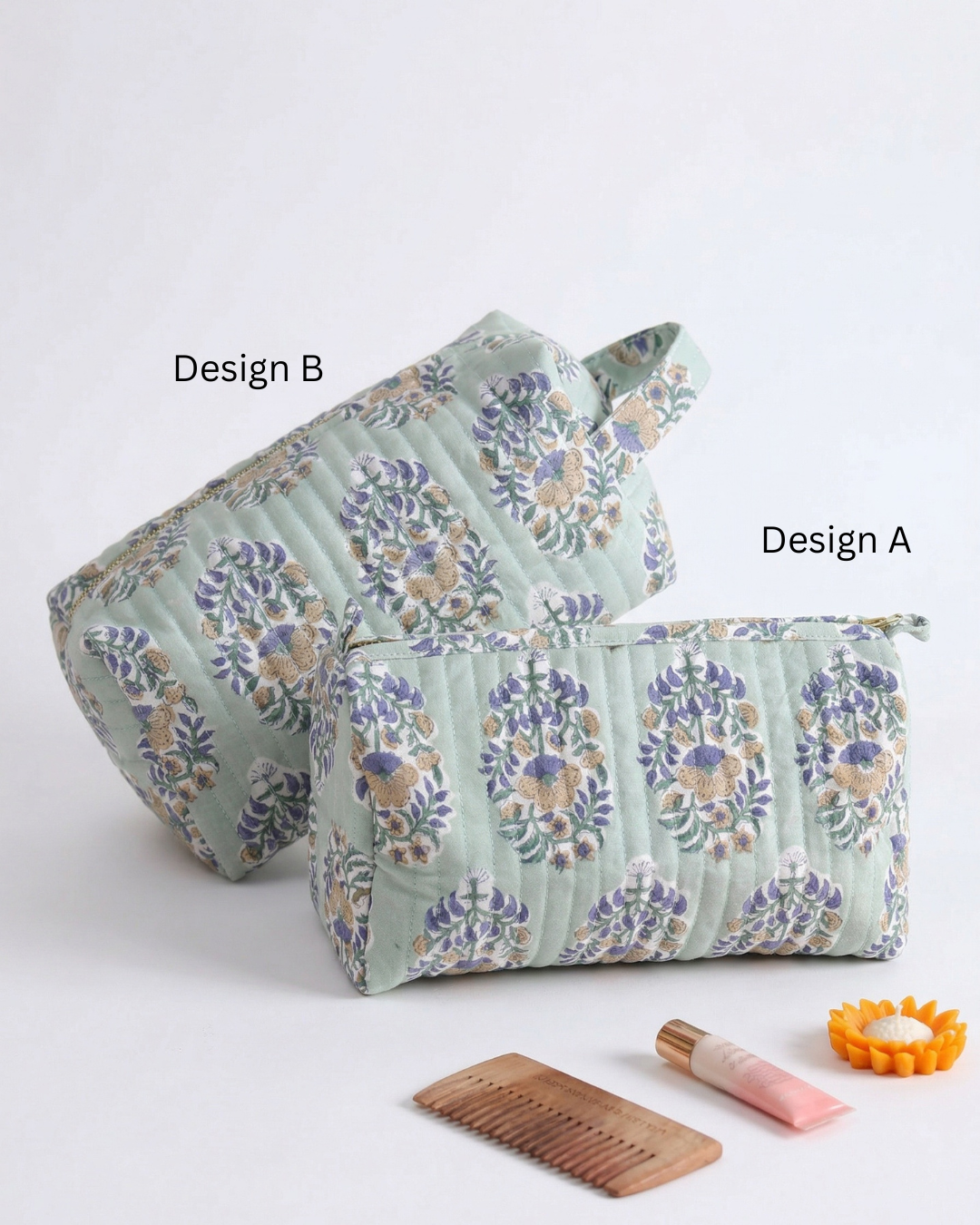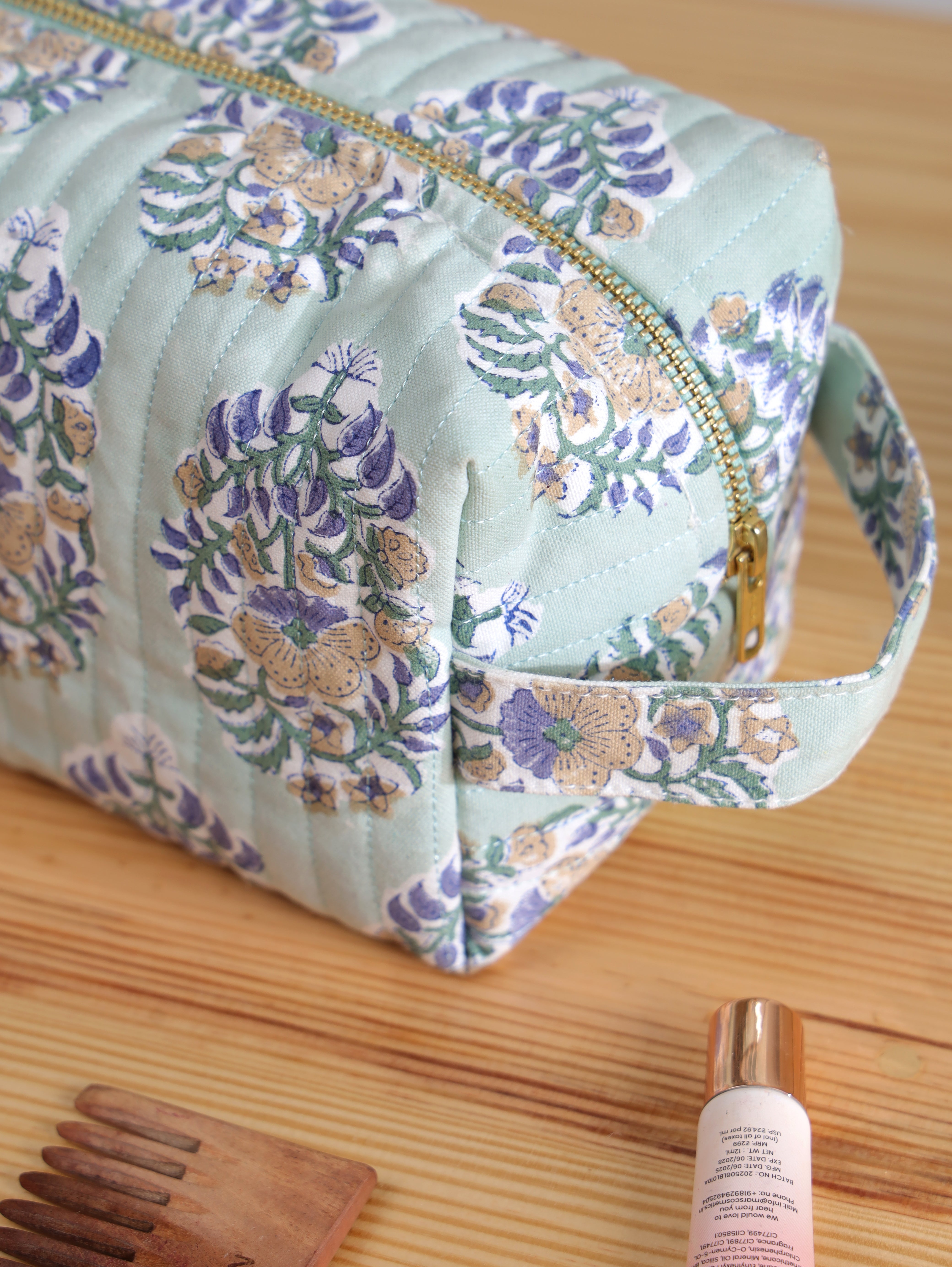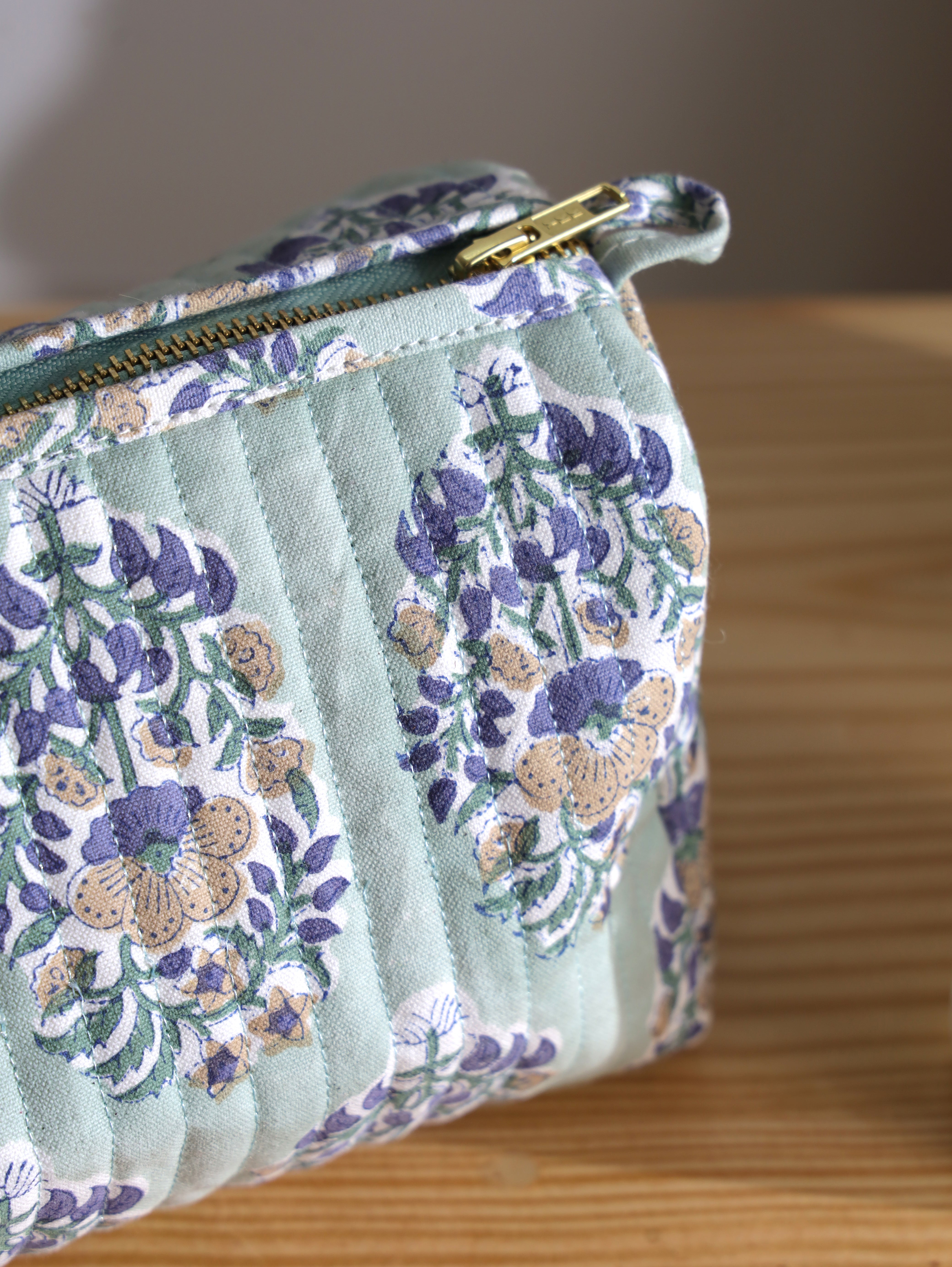 A sweet and unique range of travel/make-up bags, showcasing a harmony of colours, desires, and moods. Designed in house and hand block printed and with love and care by artisans in Jaipur, they are as practical as they are pretty.