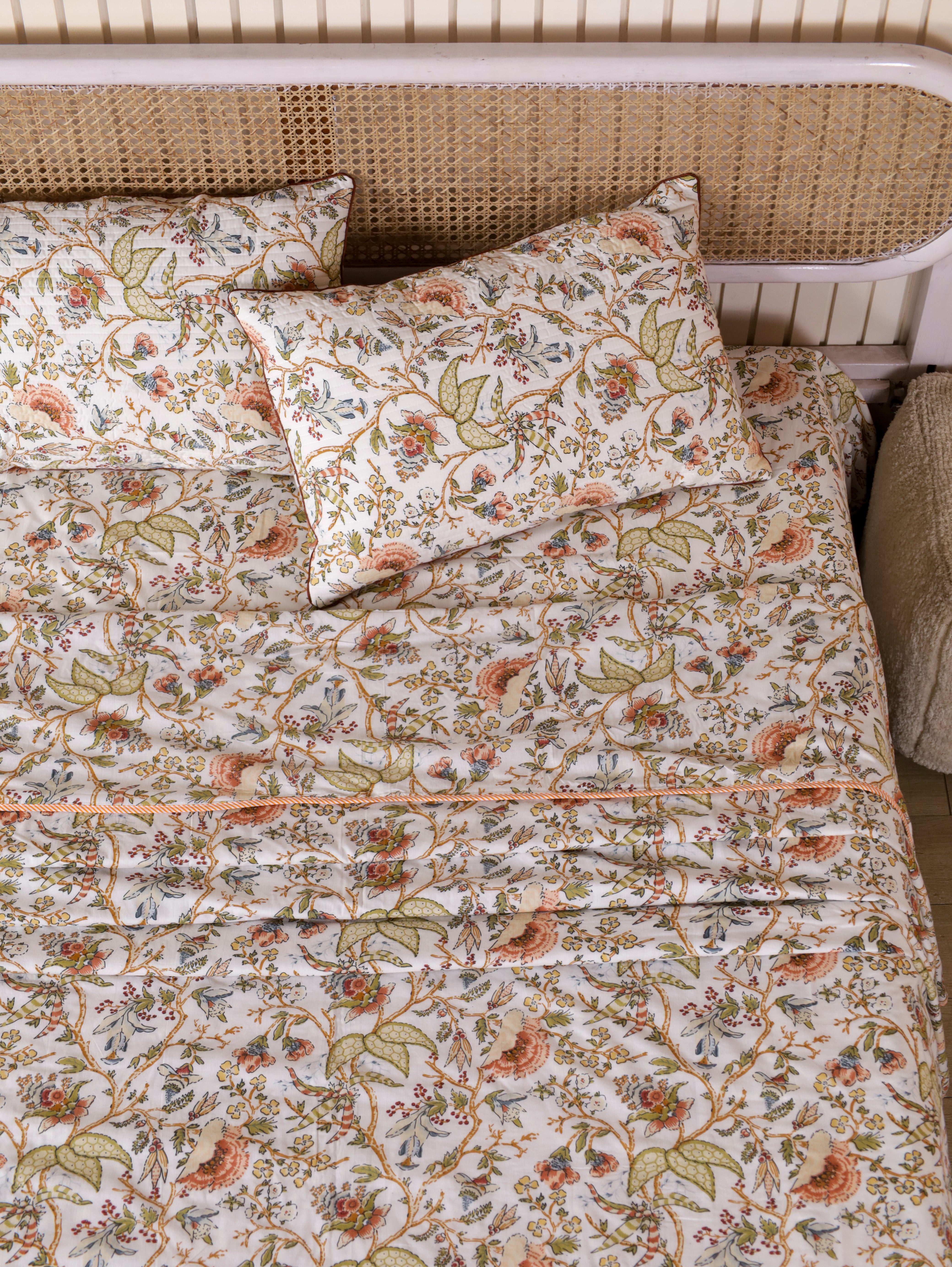 A complete bedding set featuring stylised pods, flowers, and leaves. The pattern makes for a stylish colour combination.