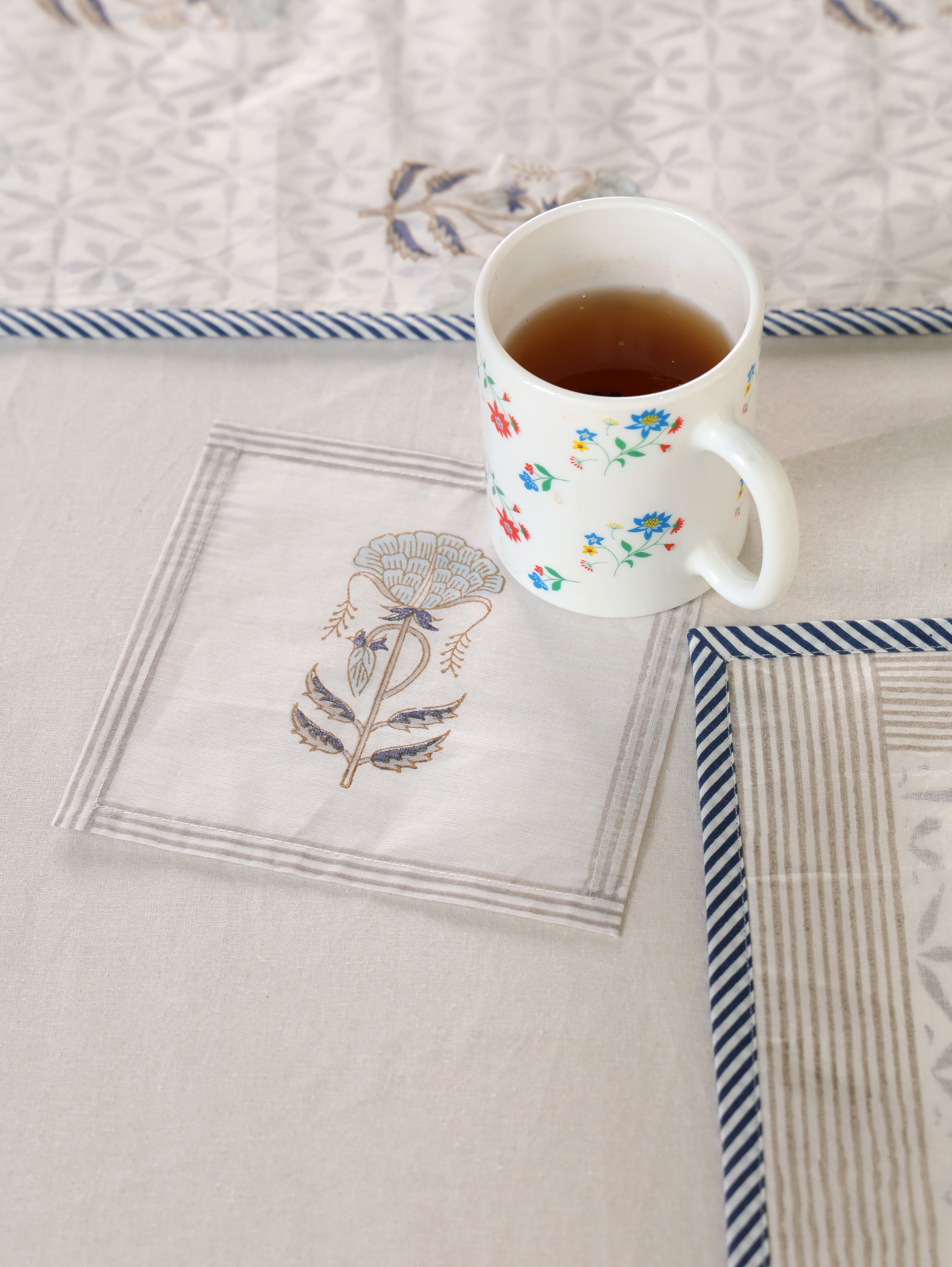 Designed to elevate the smallest rituals, these tea coasters echo the layered artistry of the collection. Hand-block printed canvas cotton meets airy organza, allowing delicate patterns to unfold gently—bringing charm and elegance to every cup served.